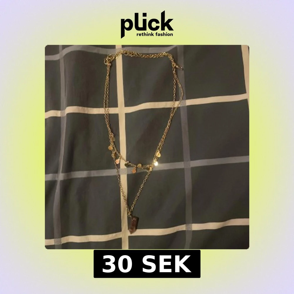Snyggt halsband i guldton med dubbla kedjor. Ena kedjan har små runda hängen och den andra har ett mörkt, rektangulärt hänge. Perfekt för att ge outfiten lite extra edge och trendig känsla.