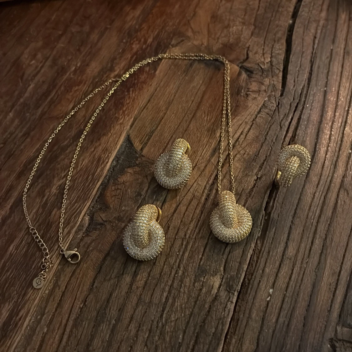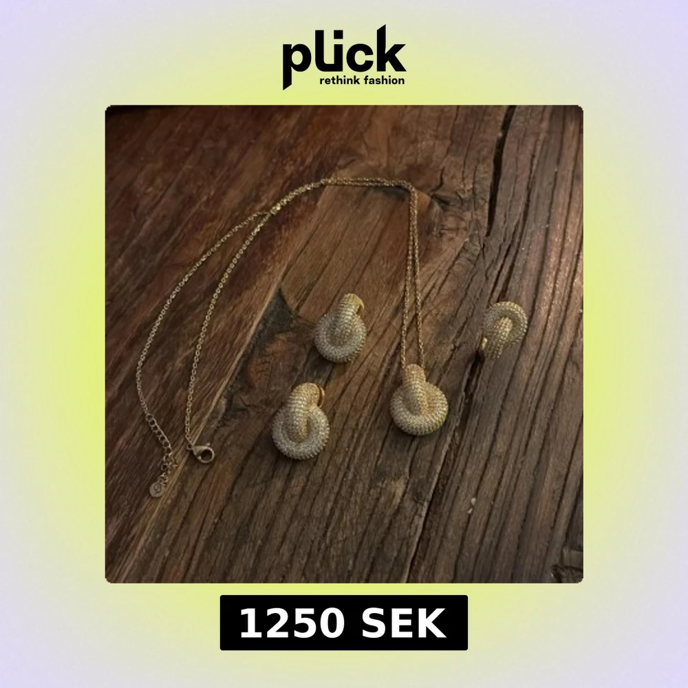 Elegant smyckeset i guld från Edblad med ett halsband och matchande örhängen och ring.Båda delarna har en unik, vriden design med glittriga detaljer som ger en lyxig känsla. Perfekt för att lyfta vilken outfit som helst.