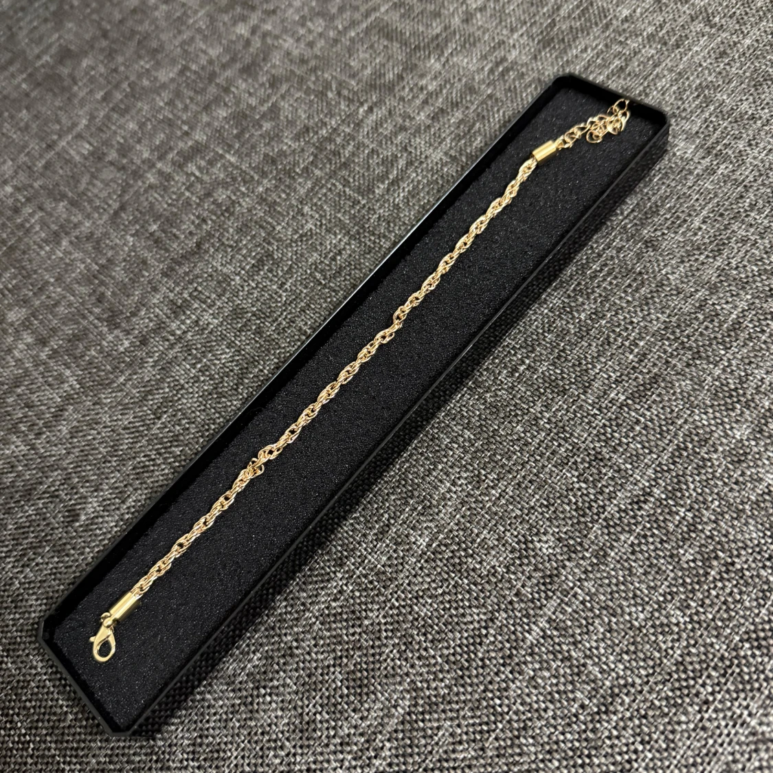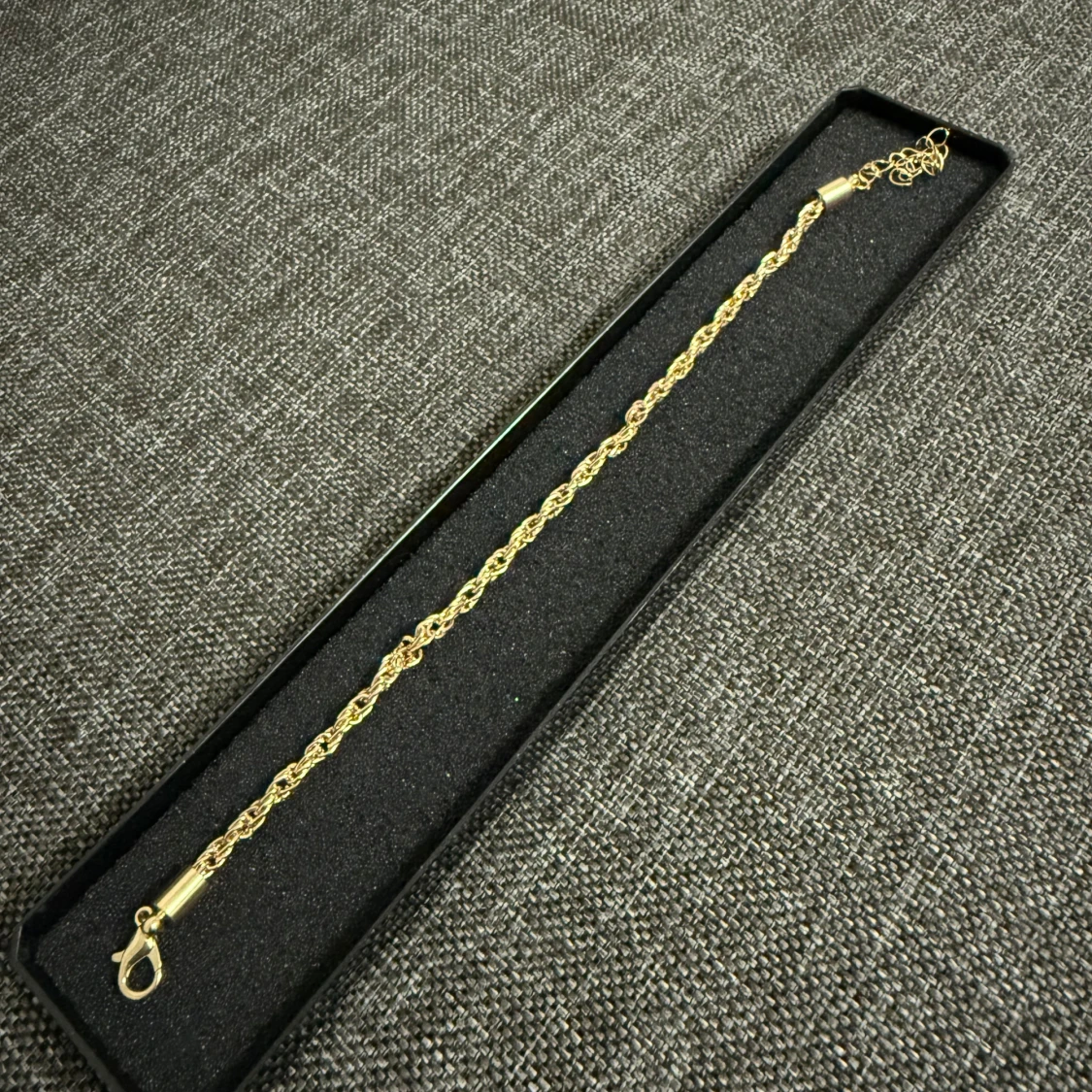 Snyggt armband i guldig färg med tvinnad kedja som ger en stilren och trendig look. Låset är av klassisk karbinmodell och armbandet levereras i en svart ask. Perfekt accessoar för att lyfta din outfit. Helt nya oanvända Vid retur står köparen för Frakten/Returen. Jag ansvarar inte för postens slarv.