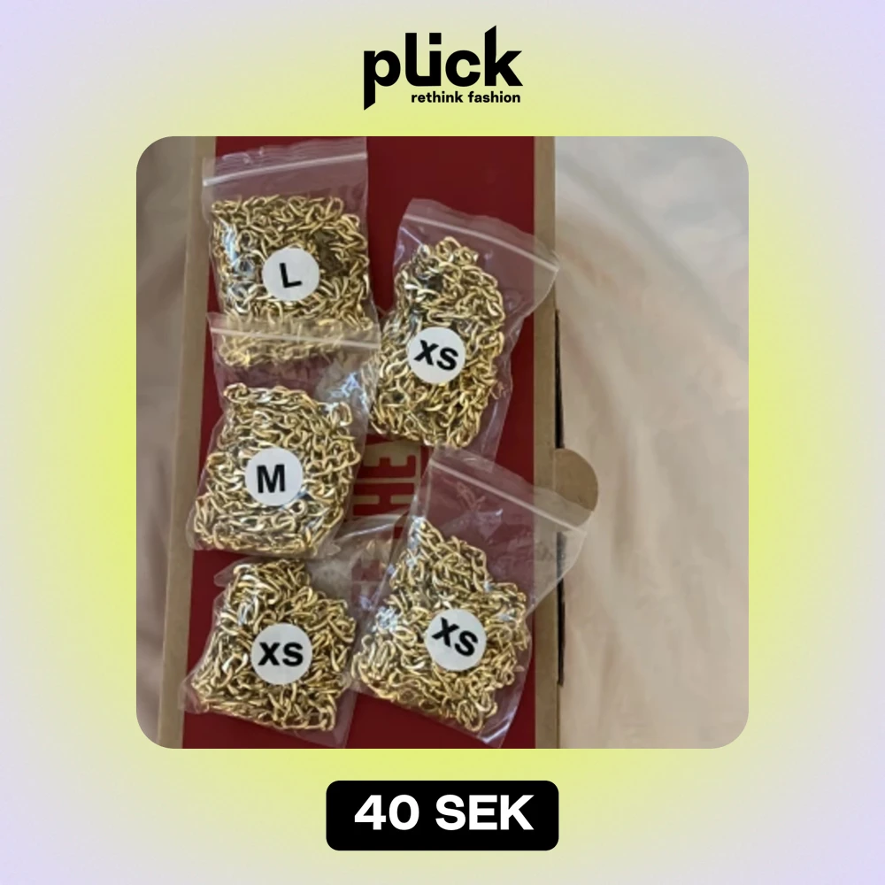 En påse med guldkedjor i olika storlekar, som kan användas till olika saker. Halsband, body chains osv