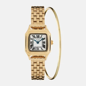 Elegant guldfärgad klocka från uropenn. Klockan har en en matchande armring som man också får med. Super stilren o populär, den är endast använd ca 2 gånger & vid köp får man med box osv! Perfekt för att ge en lyxig touch till din outfit. Kostade 599kr nytt men säljer för endast 199kr