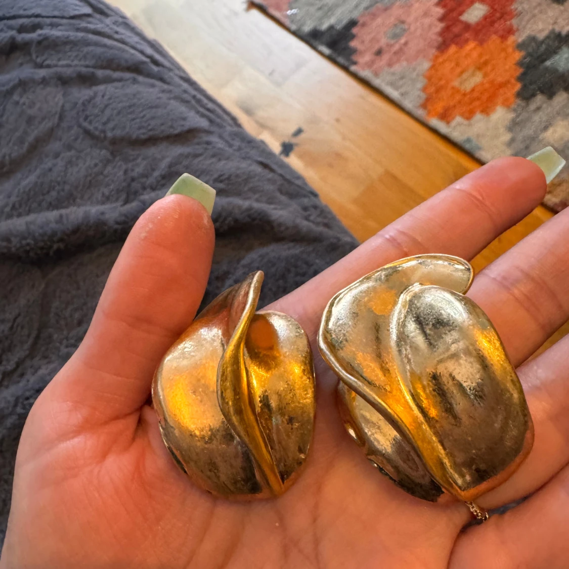 Säljer ett par unika guldörhängen från Zara med en organisk, böljande form. De är stora och iögonfallande, perfekta för att ge en extra touch till din outfit. Örhängena är i guld och har en glansig yta som reflekterar ljuset vackert. Passar perfekt till fest eller andra speciella tillfällen.