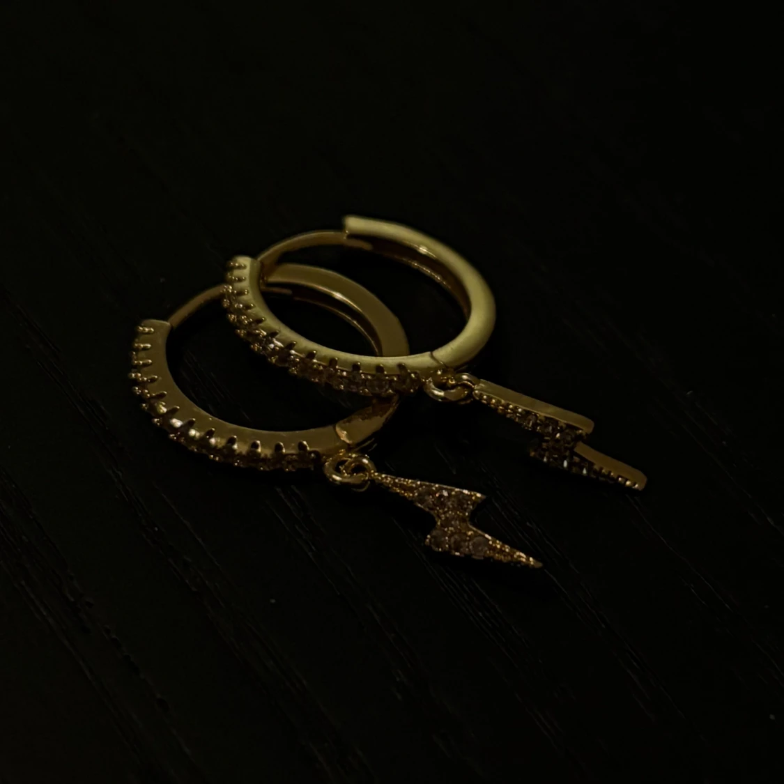 Snygga guldörhängen med små blixtformade berlocker. De har en glittrig yta som ger en extra touch av stil. Perfekta för att liva upp vilken outfit som helst, oavsett om det är till vardags eller fest. Ett måste för alla som älskar unika smycken!