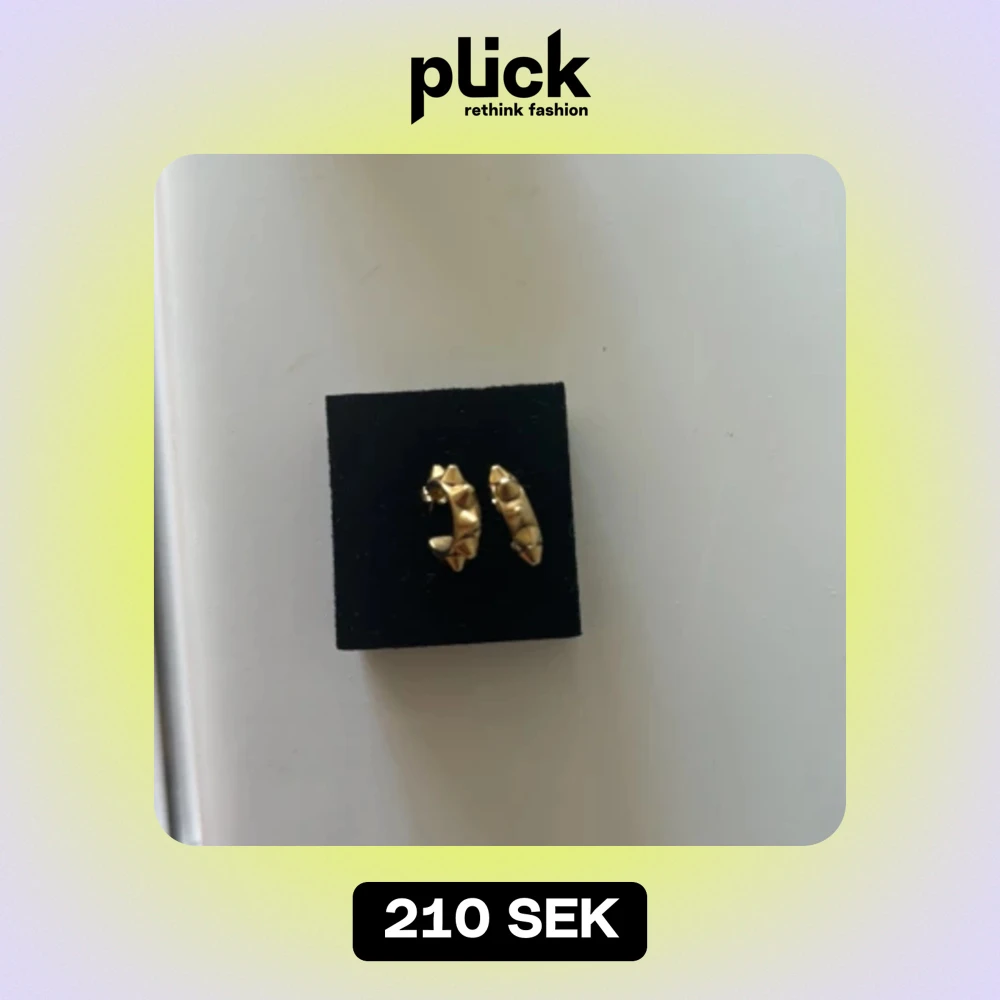 Säljer ett par coola guldörhängen med nitar. De är i form av små hoops och har en edgy design som verkligen sticker ut. Perfekta för att ge din outfit lite extra attityd!