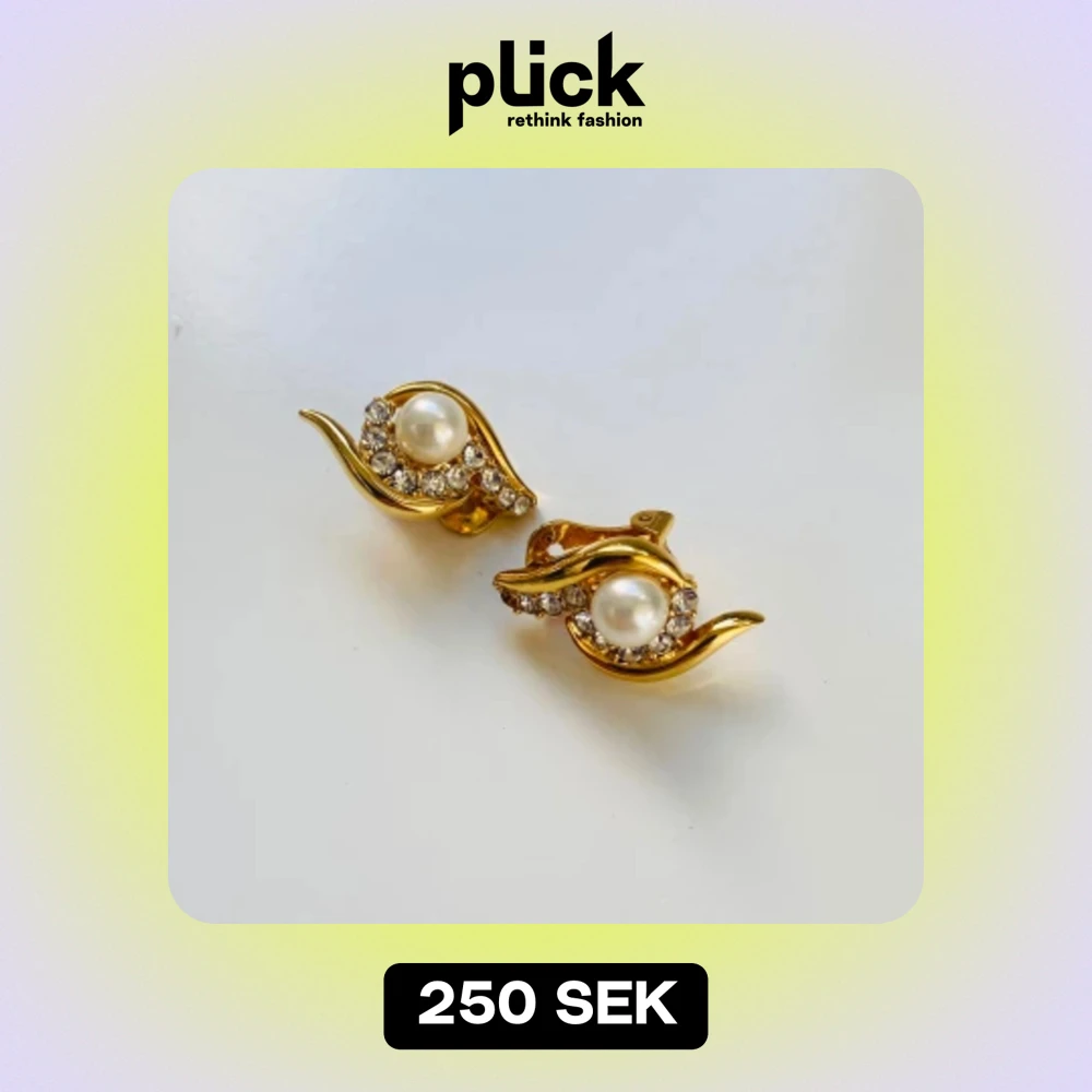 Säljer ett par eleganta guldörhängen med pärlor och strass. De har en vacker design med en stor pärla i mitten omgiven av gnistrande strass. Örhängena är clip-ons, vilket gör dem perfekta för dig som inte har hål i öronen. De är i nyskick och redo att bäras till fest eller andra speciella tillfällen. Måtten kan ses på bilden med måttbandet.