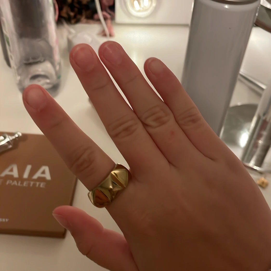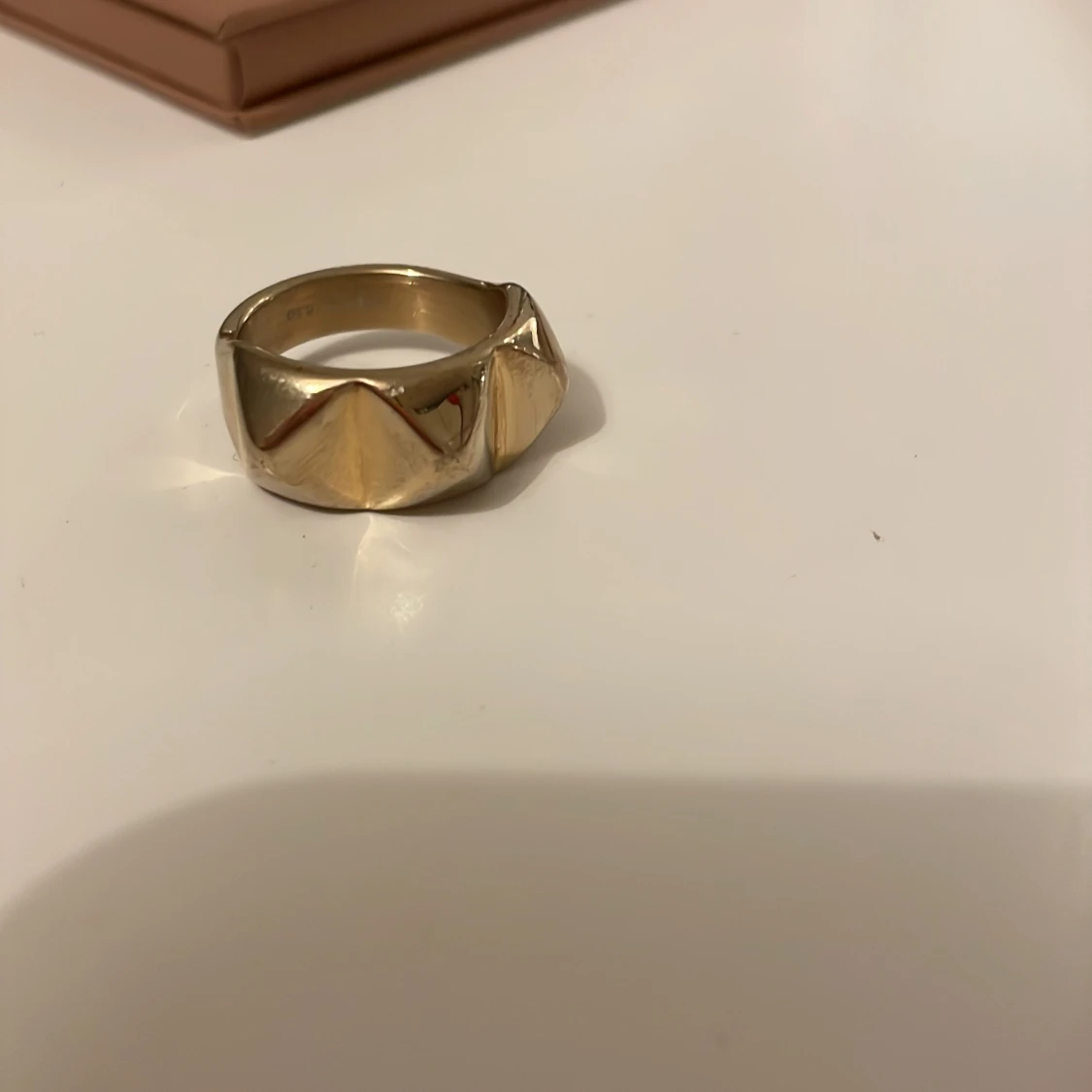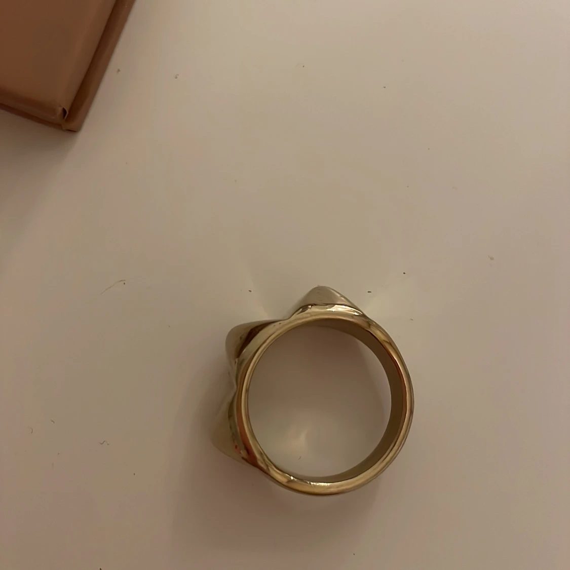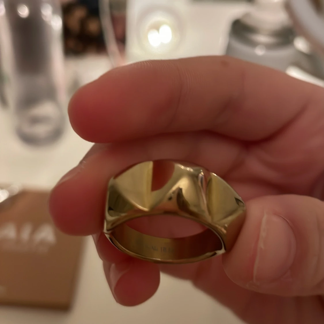 Snygg guldfärgad ring med ett unikt geometriskt mönster. Ringen har en bred design och en glansig yta som ger ett modernt och stilrent intryck. Perfekt för att ge en extra touch till din outfit. Från edblad