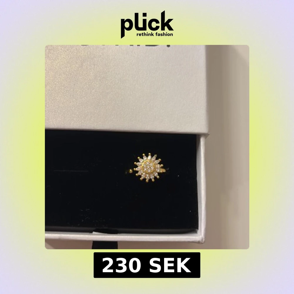 Snygg guldfärgad ring från Astrid med en glittrig blomformad design på toppen. Ringen har vita stenar som ger extra bling och är justerbar i storlek. Perfekt för dig som gillar unika och trendiga smycken med lite extra sparkle. Men har ett litet dåligare snurr än vanligt så därför billigare