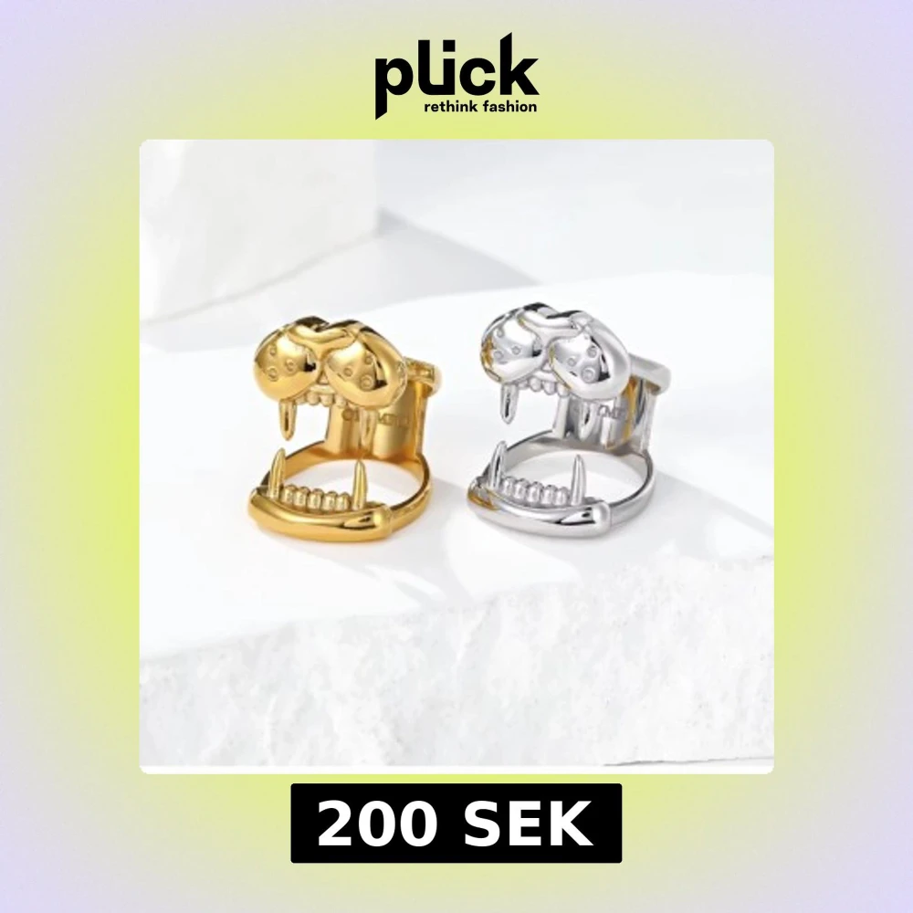 Säljer min guld ring (rostfritt stål) med coolt hundhuvud och vassa tänder. Ringen har en unik design som sticker ut och passar dig som gillar edgy accessoarer. Perfekt statement piece för att lyfta din stil.