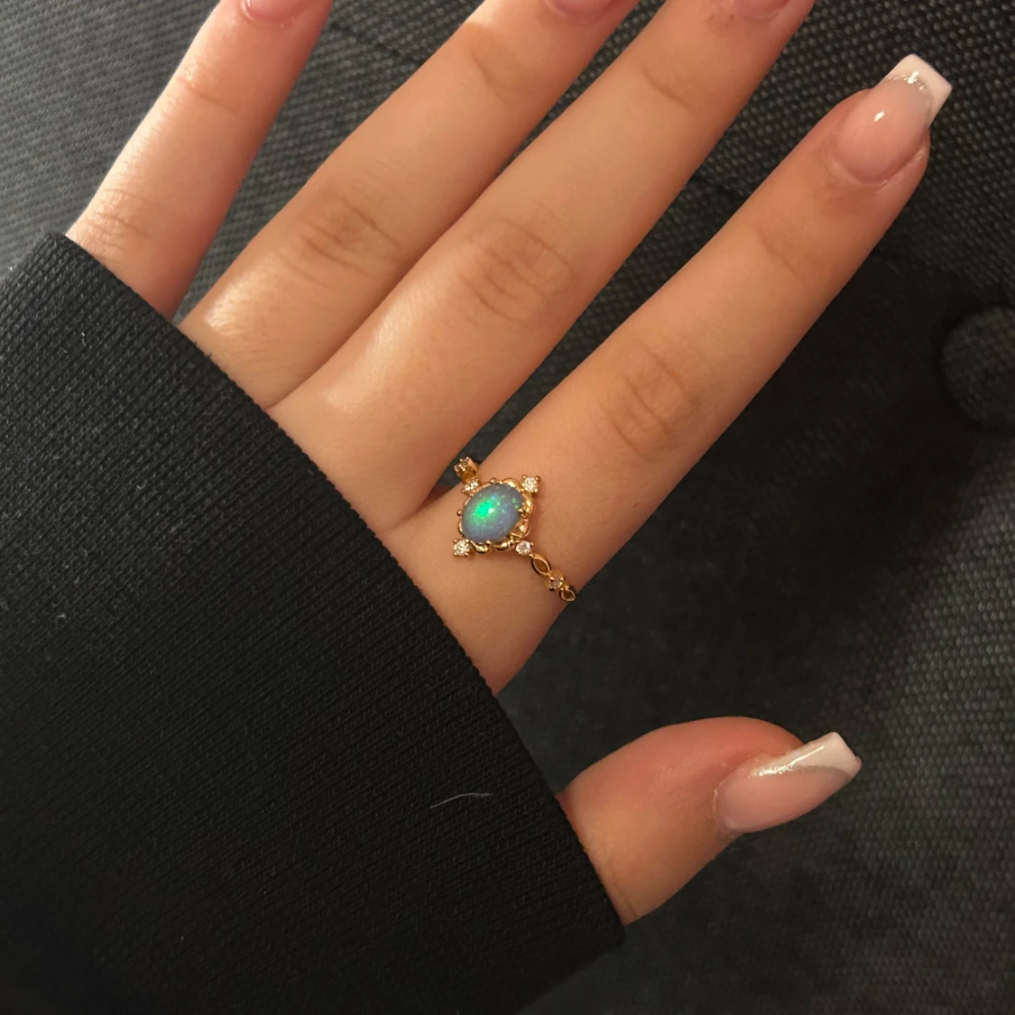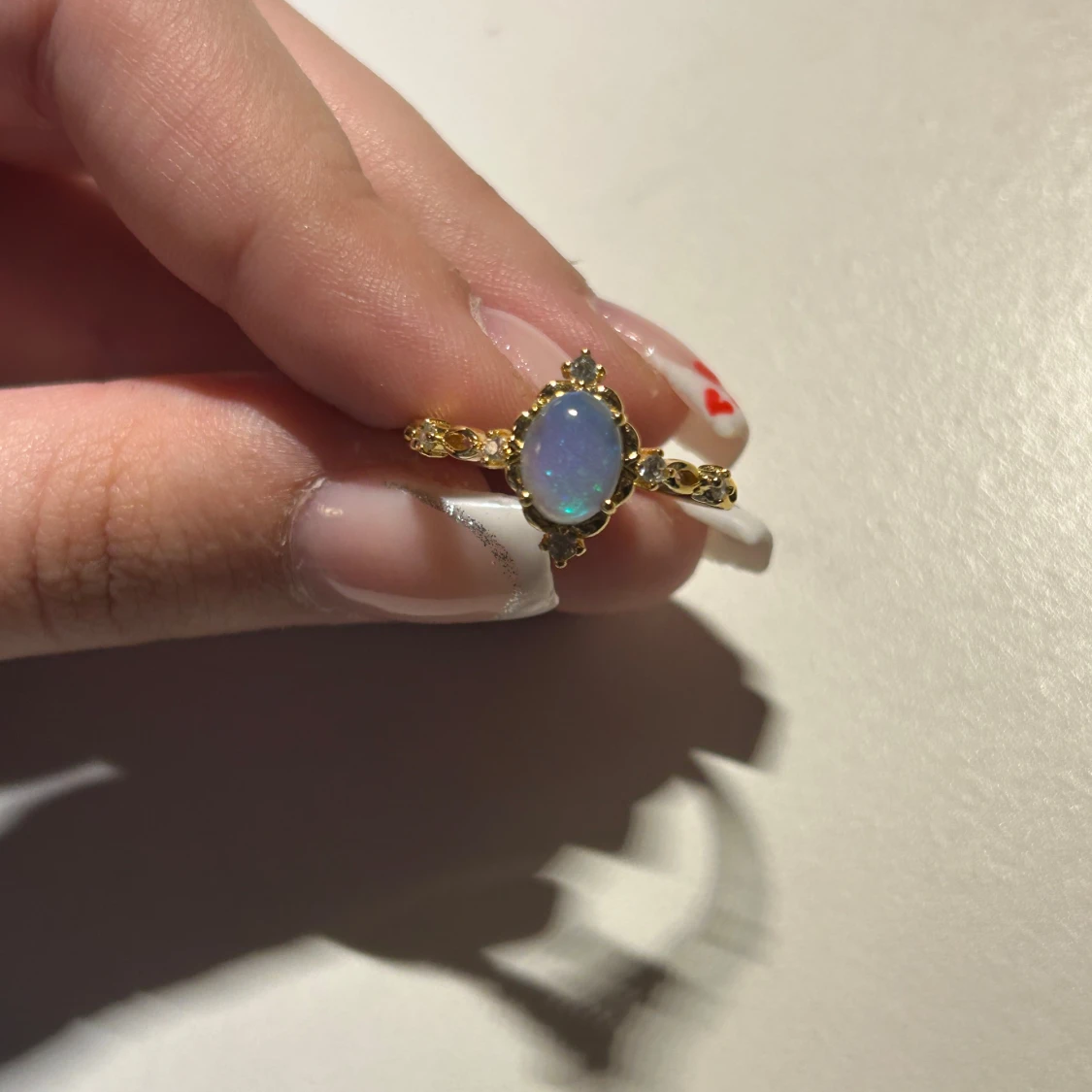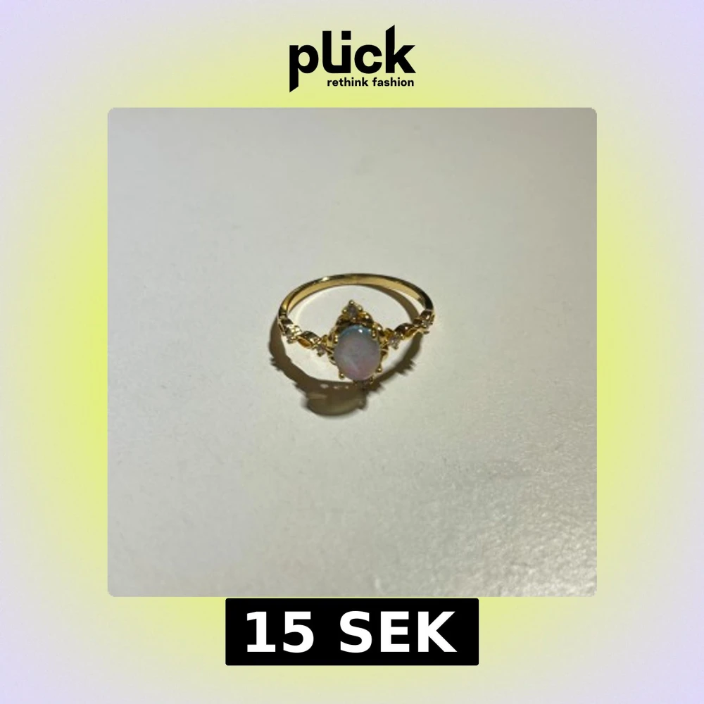 En superfin och elegant guldfärgad ring med en vacker opal i centrum.💙Ringen har detaljerade utsmyckningar runt stenen som ger en lyxig känsla. Perfekt för att ge en touch av glamour till din stil.✨Säljs då den är för stor för mig