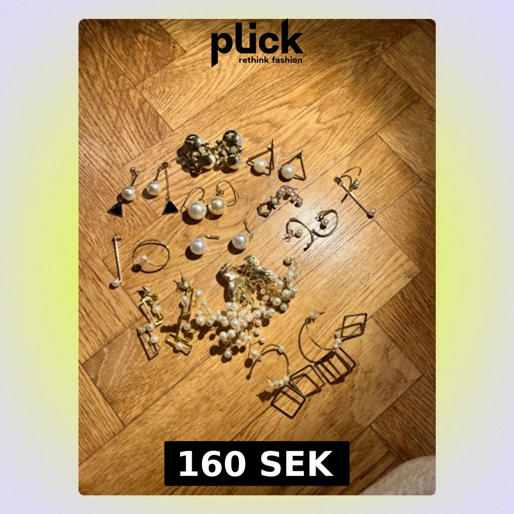 Säljer ett coolt set med örhängen i olika stilar – flera med vita pärlor, guldiga detaljer och geometriska former som trianglar och fyrkanter. Vissa har svarta inslag, andra är mer statement med hängande pärlor. Perfekt för dig som gillar att variera din look.
