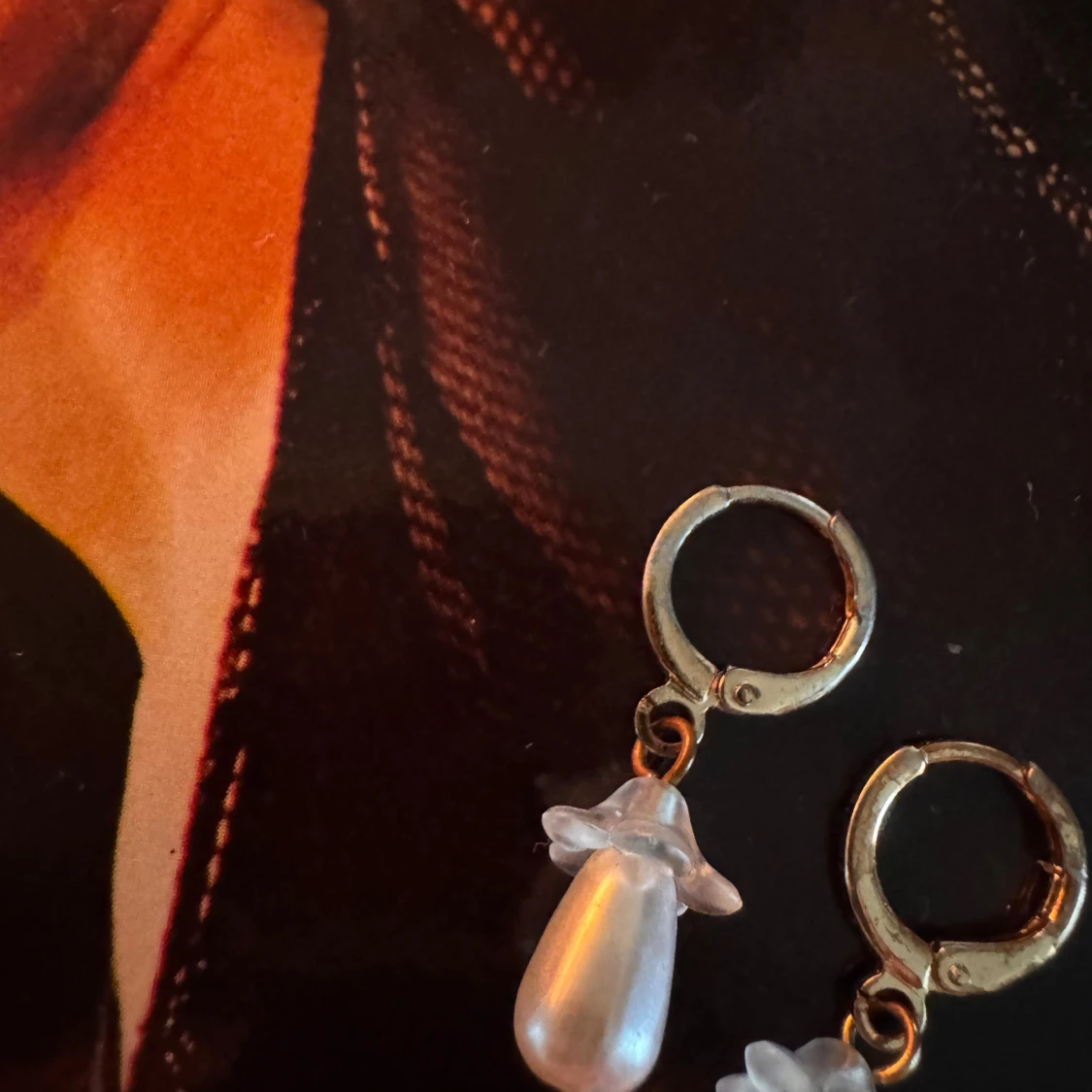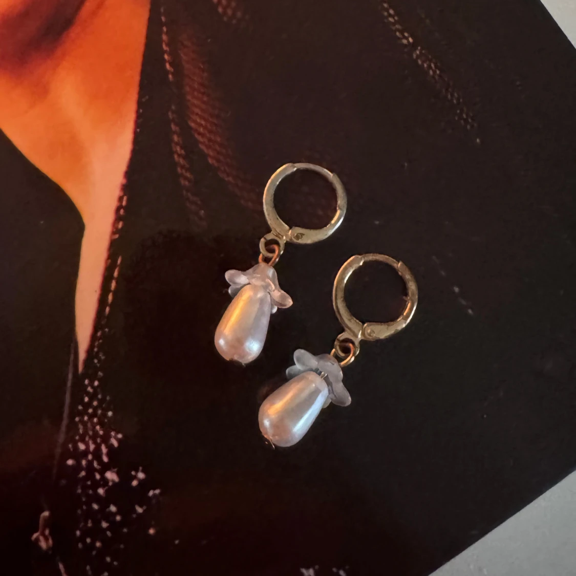 Superfina örhängen med guldfärgade ringar och hängande vita pärldroppar formade som små blommor. Perfekt för dig som gillar unika detaljer och vill ha något som sticker ut. Ger en söt och elegant känsla!