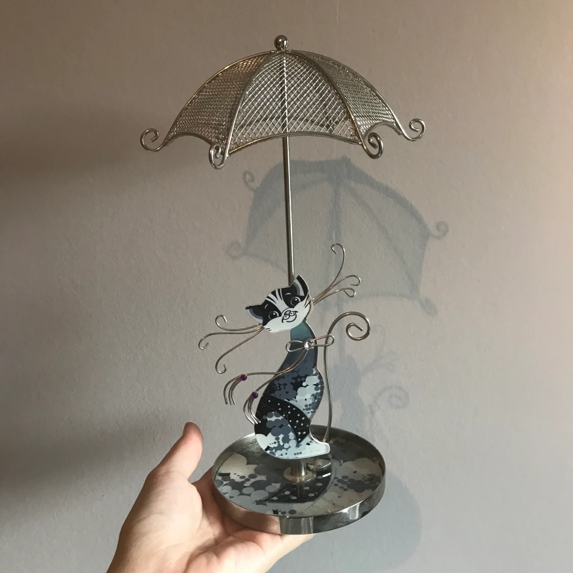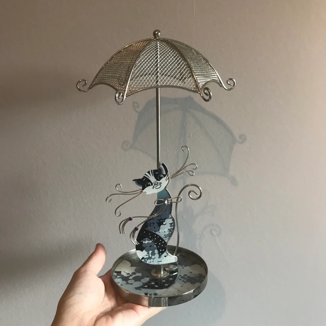 Ett jättegulligt smyckesställ med en katt och ett paraply där man kan hänga örhängen, halsband, och ringar. Ursprungligen köpt på glitter, köparen står för frakt