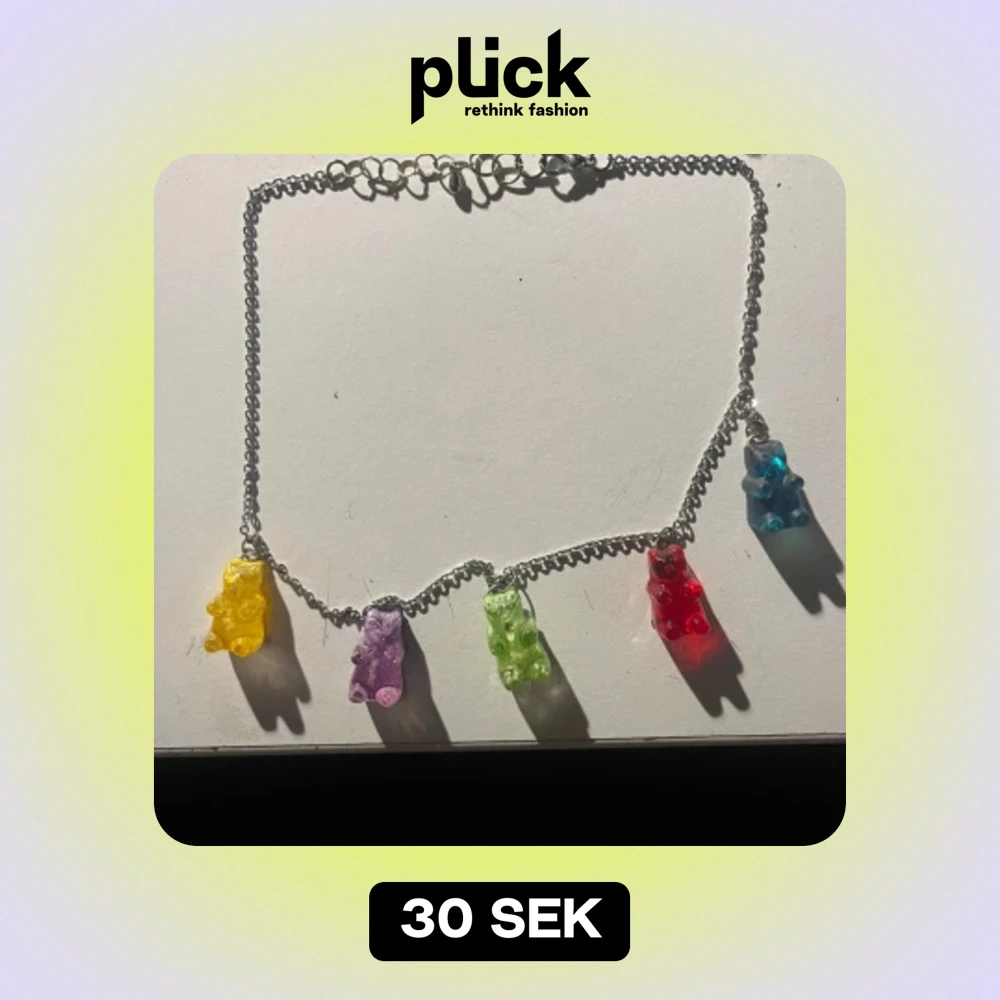 Säljer ett gulligt halsband med plast gummi björnar på! Köpte det 2021 och det är knappt använt, alltså helt nyskick! Det sitter rätt högt upp på halsen. Kontakta mig om du har frågor eller så!