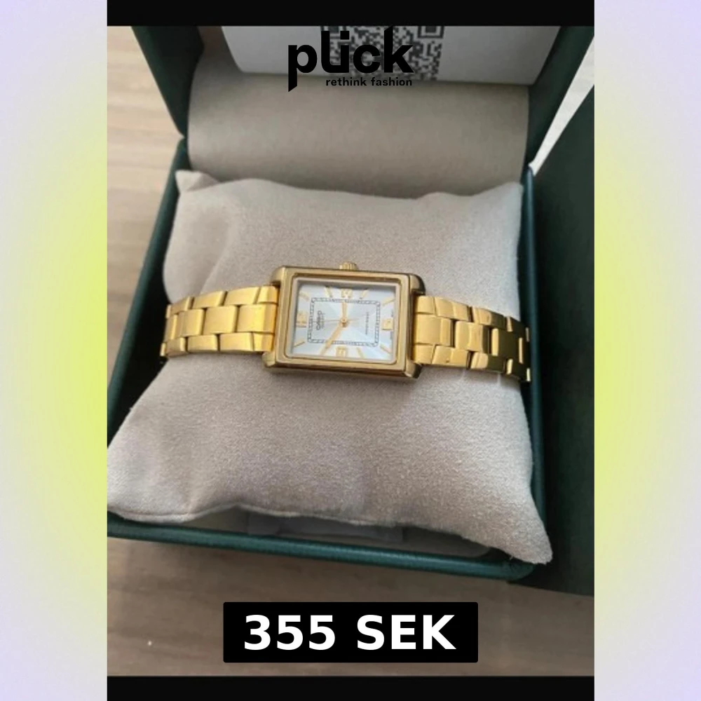 Snygg guldfärgad klocka från Casio med fyrkantig boett och länkarmband i metall. Urtavlan är vit med guldiga detaljer och siffror, vilket ger en clean och klassisk look. Perfekt för dig som gillar stilrena accessoarer med lite lyxig känsla.