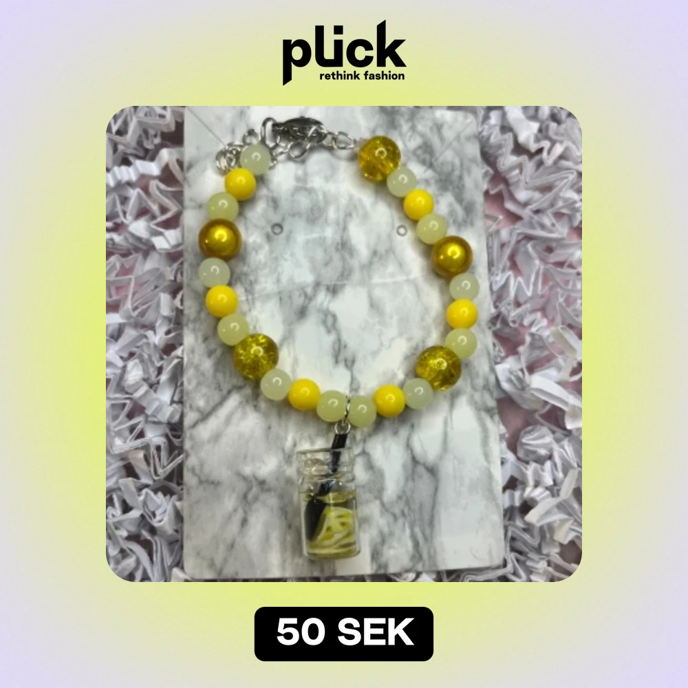 Gult armband med silvrig kedja som går att justera, armbandet har även en gul berlock.
