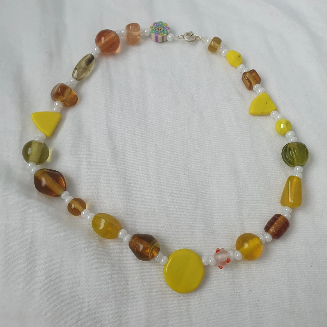 Gult halsband med olika pärlor. Går att knäppa. Längd: 40 cm