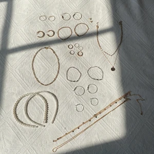 Nu säljer jag smycken och diadems, det man får med i detta är två halsband, två guldiga armband, 2 silvriga armband, 5 ringar, 4 silverörängen, 8 guld örhängen, 3 diadem, 2 magband eller vad man ska säga man har runt magen. Råka lägga till bud, allt 200kr