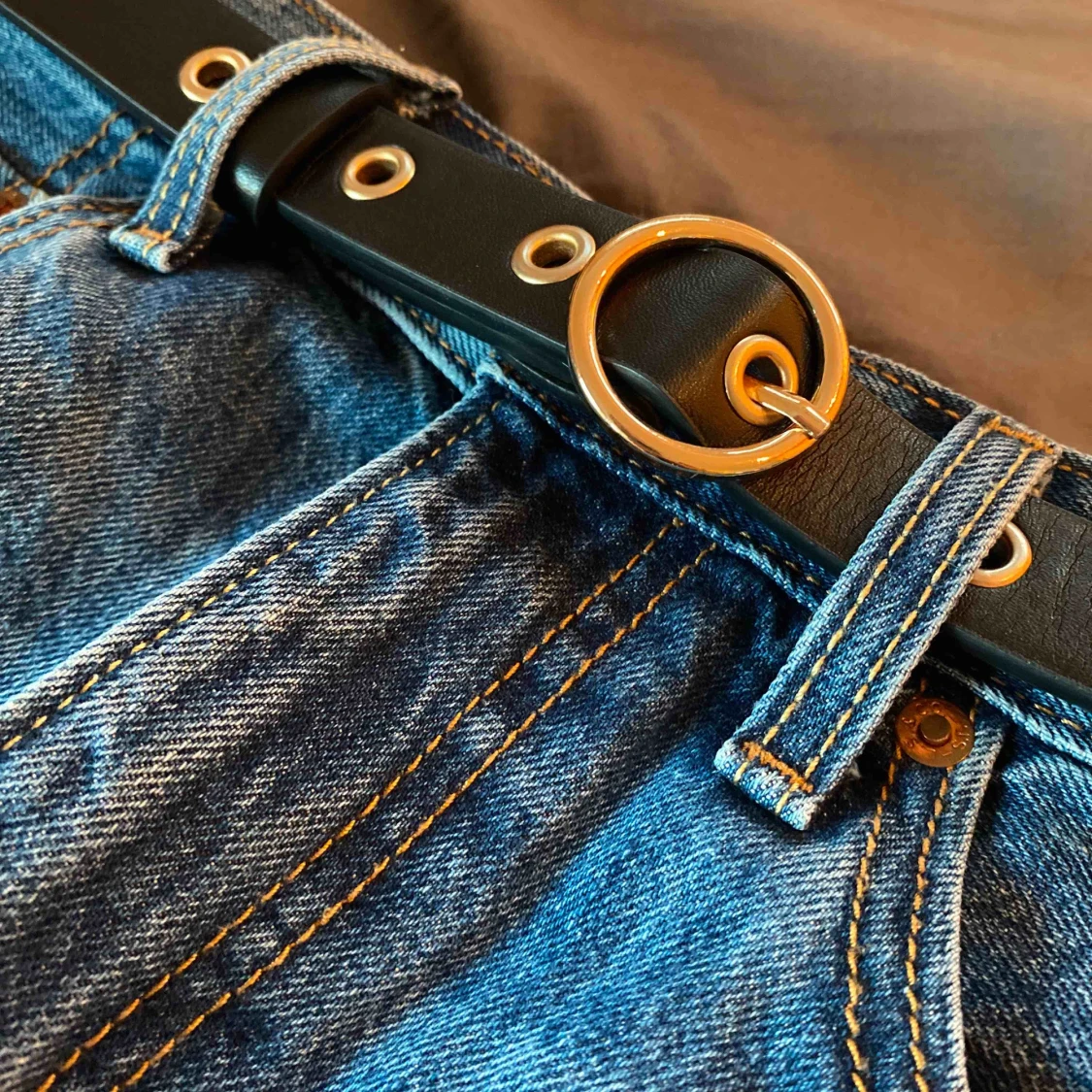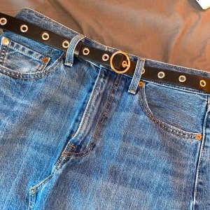 Svart fakeskinn skärp med gulddetaljer. Aldrig använd. Frakt är inkluderat i priset