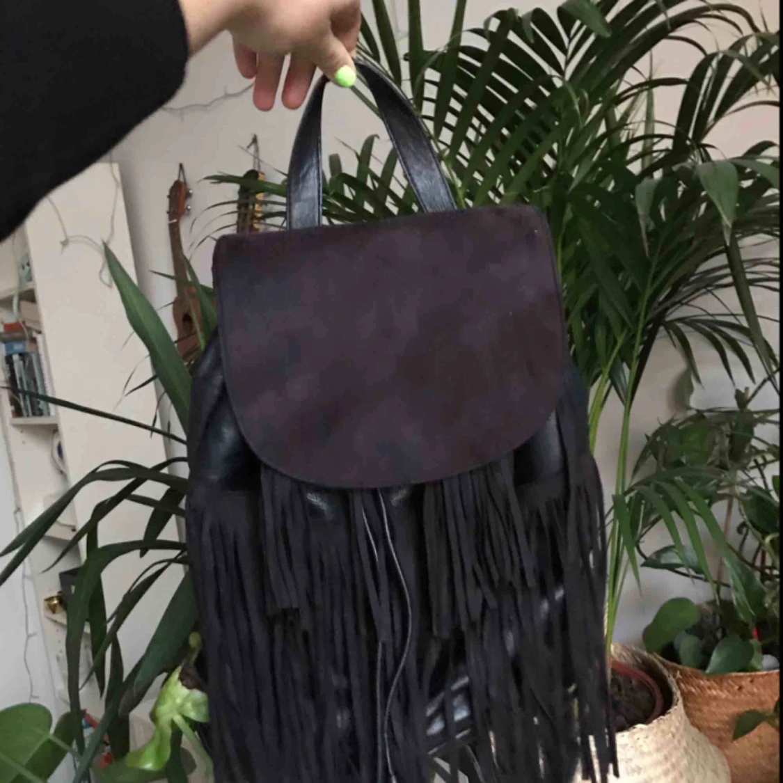 Svart ryggsäck med fransar framtill. Stängs genom att dra åt snöre och stänga med locket. Använd men fortfarande i bra skick.