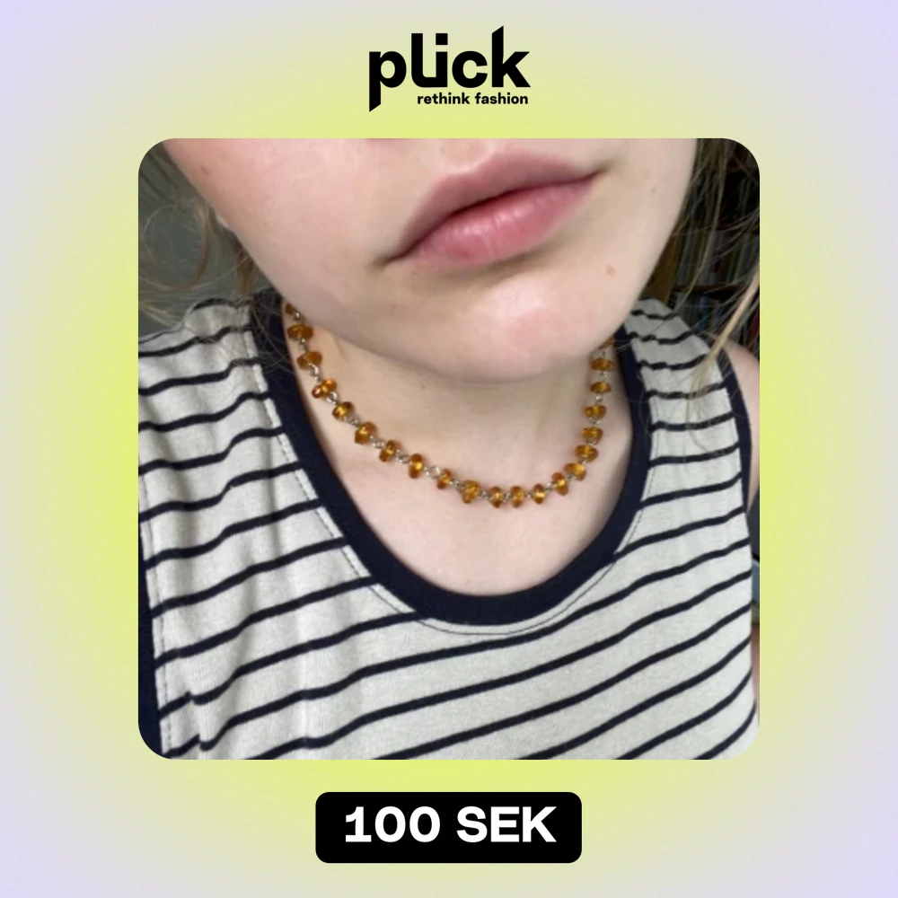 Vackert halsband med fina bärnstensfärgade glaspärlor.