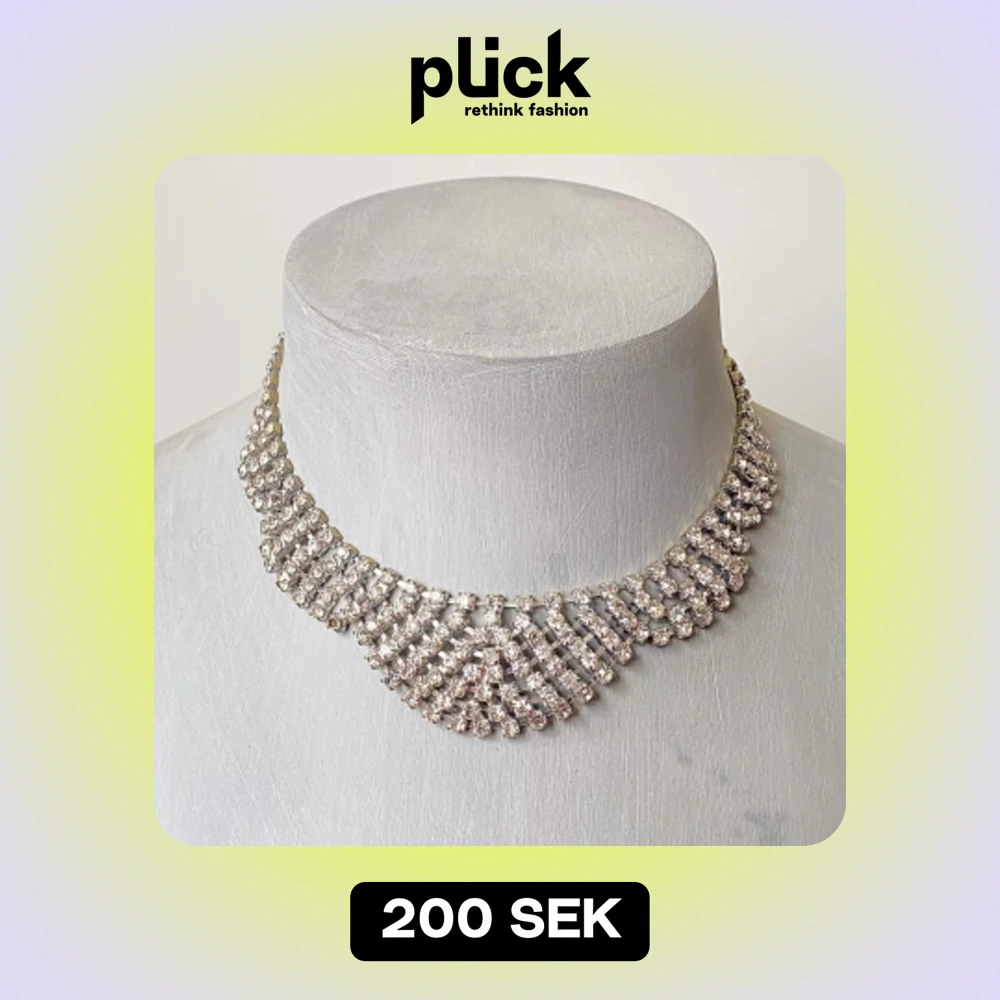 Säljer ett superglittrigt halsband med massor av strass som verkligen fångar ljuset. Det har en vacker, flätad design som ger en lyxig känsla. Perfekt för fest eller nyår! Halsbandet är justerbart med en kedja och ett enkelt lås i bak.