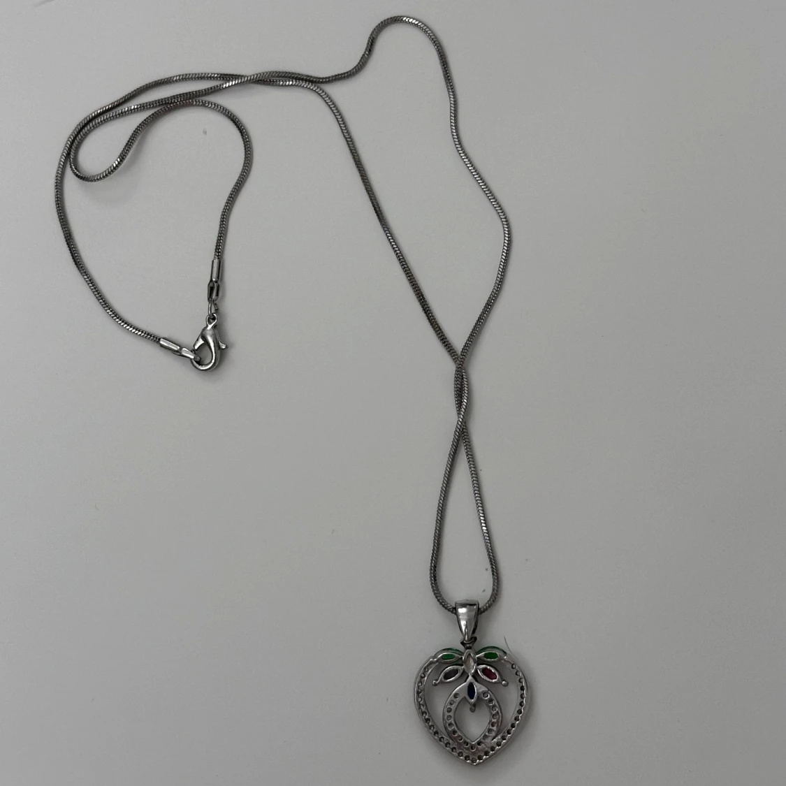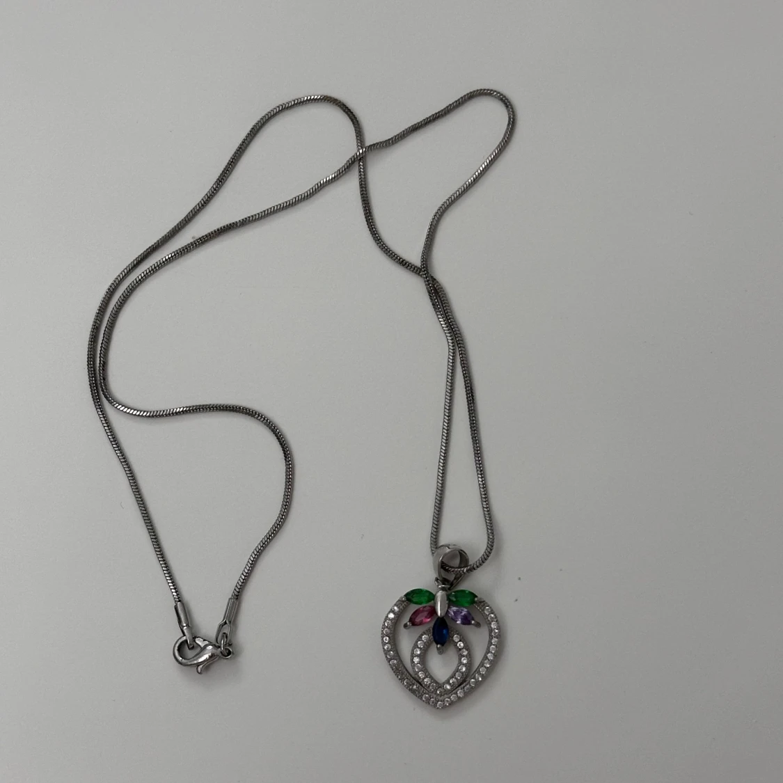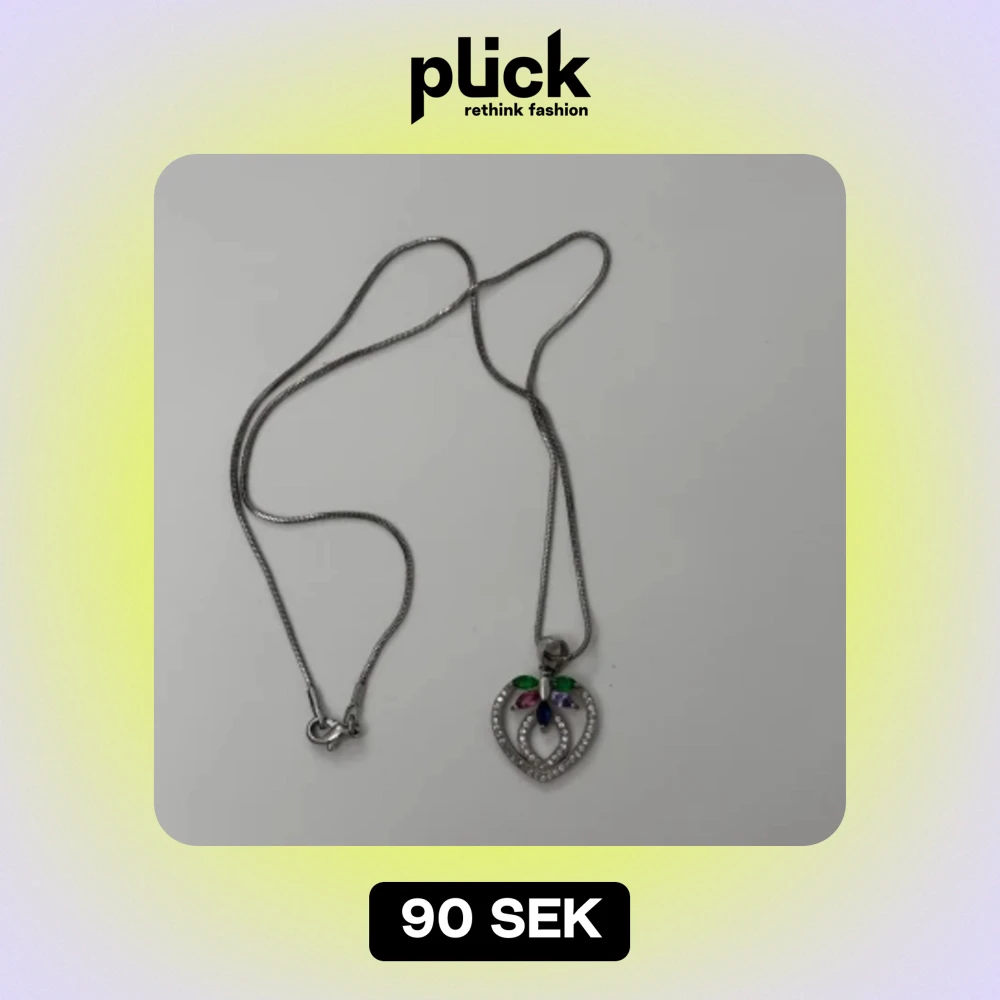 Jättefint silvrigt halsband som är aldrig använd! Fin form och fina färger!! Ganska lång men justerbar!!