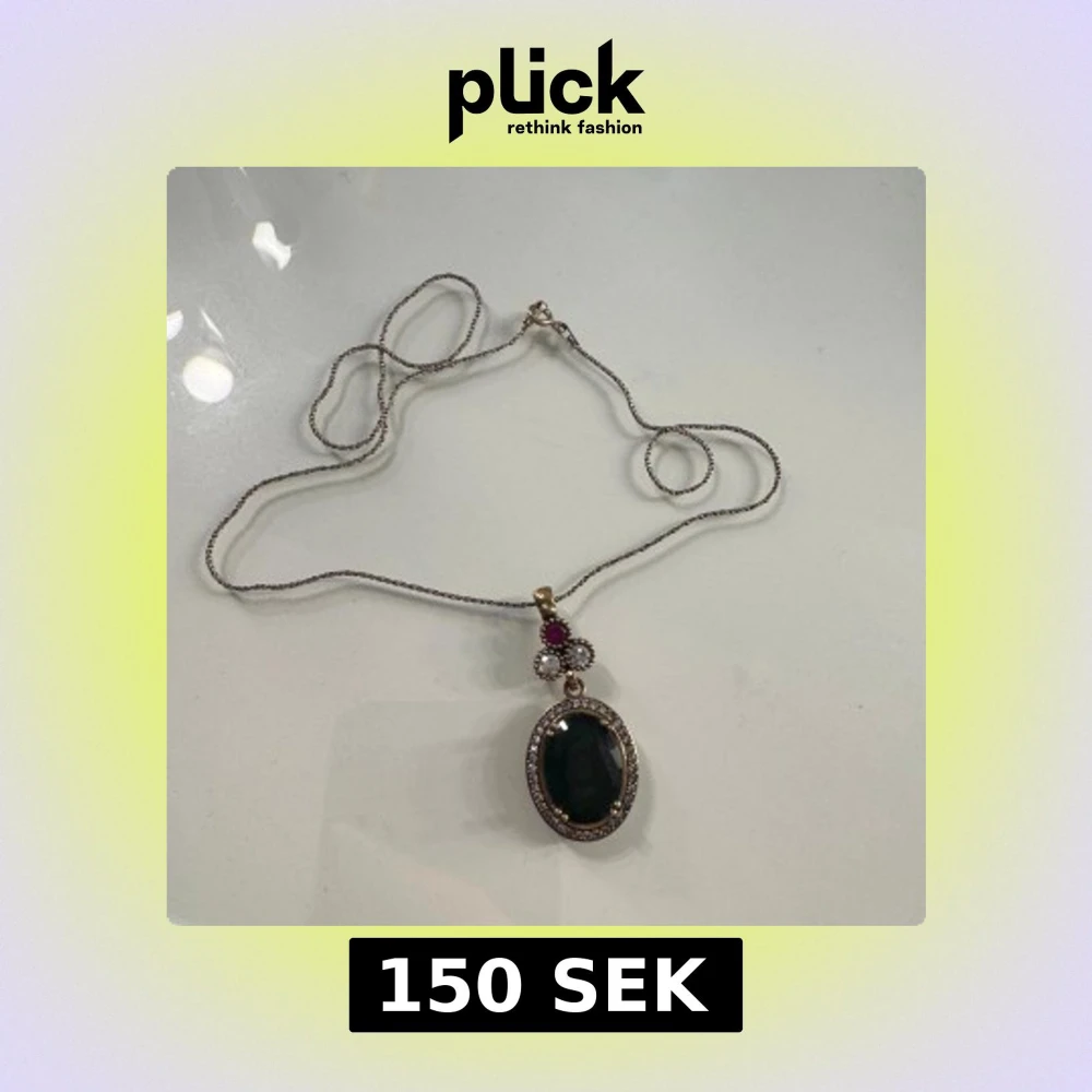 Unikt halsband med tunn silverfärgad kedja och stort ovalt hänge. Hänget har en mörkgrön slipad sten i mitten, omgiven av små klara stenar och detaljer i guldton. Ovanför sitter två klara stenar och en mindre rosa sten. Kedjan är 42cm lång