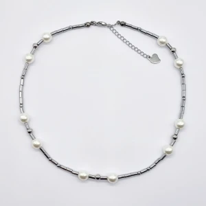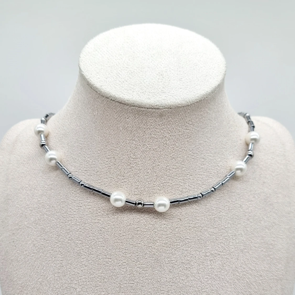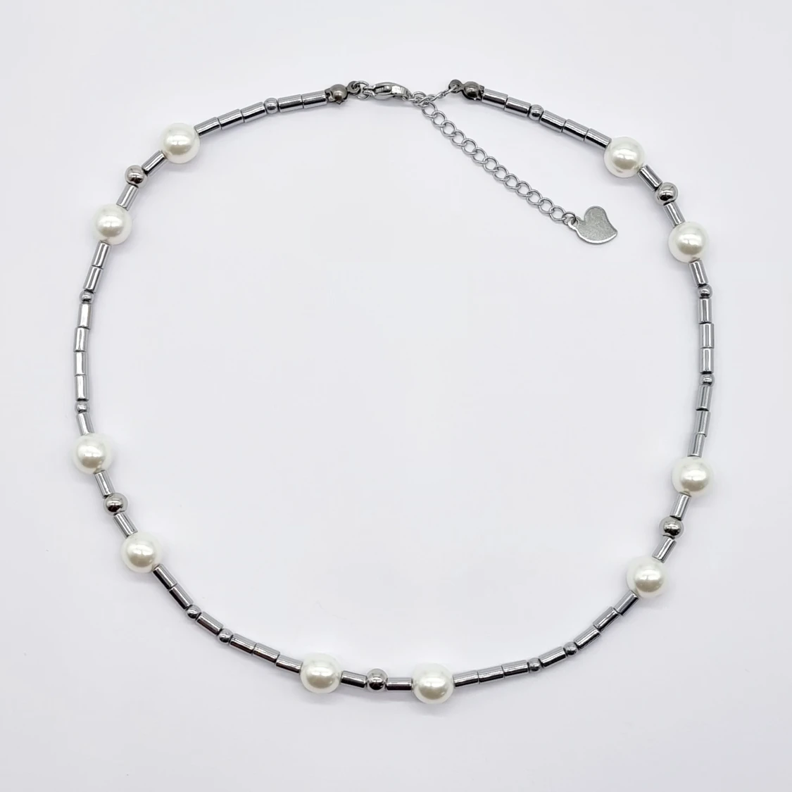 Unik handgjort halsband. Material-Mineral Hematit, glas pärlor, rostfritt stål. Nickel fri. Längd: 40cm+4cm