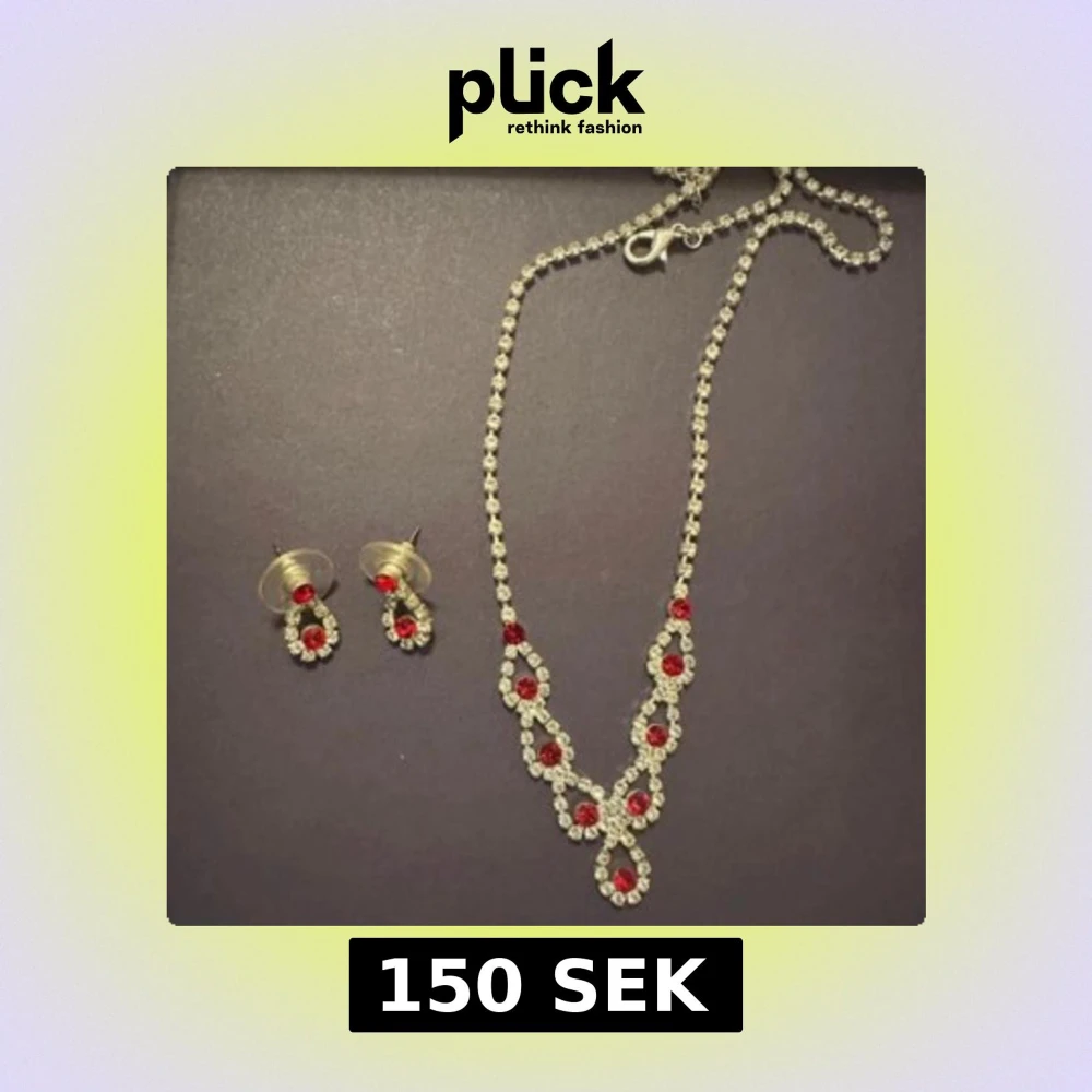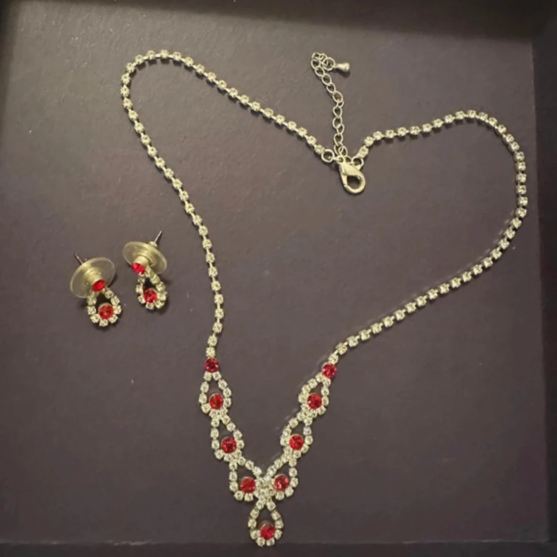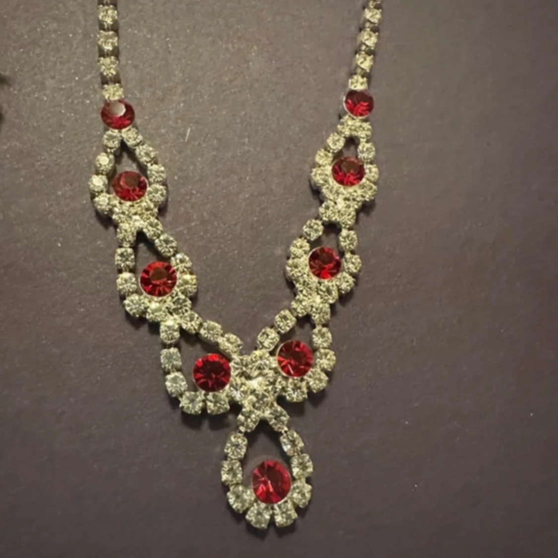 Set med halsband och örhängen i silverfärg med gnistrande klara stenar och röda kristaller. Halsbandet har droppformade detaljer och örhängena matchar med samma form och färg