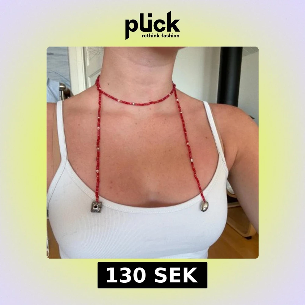 Unikt handgjort halsband med små röda och vita pärlor, dekorerat med två berlocker. Kan stylas på många olika sätt - som choker eller långt halsband. Perfekt för dig som vill ha något personligt och färgstarkt. kontakt mig med önskade farg, berlocker, och storlek! priset är förhandlingsbart ☺️