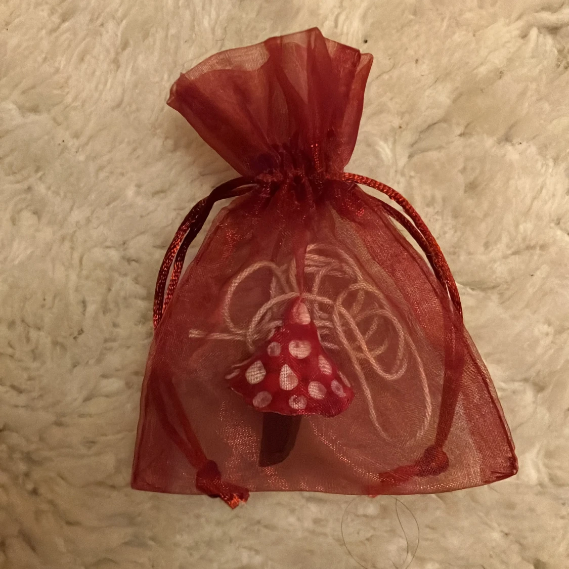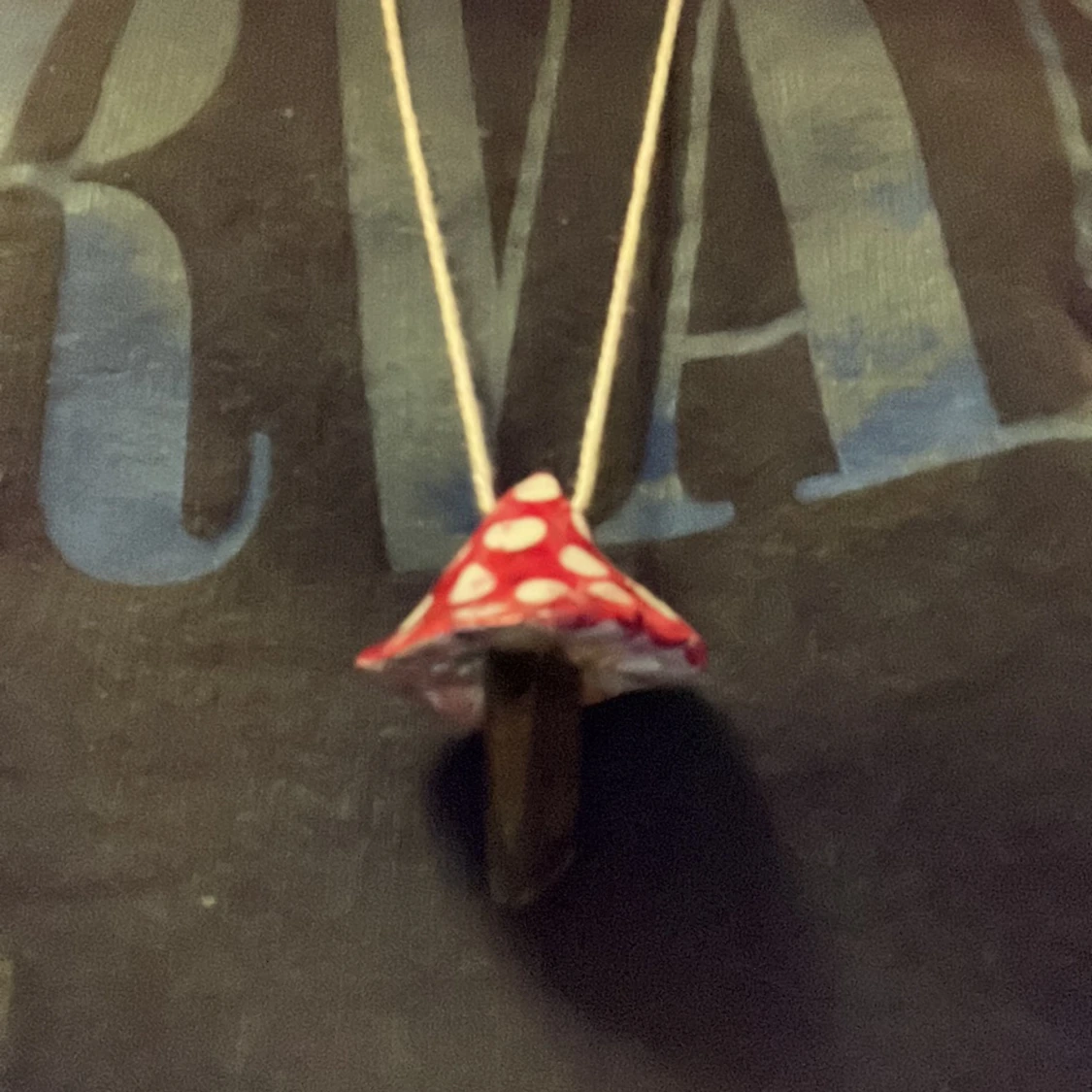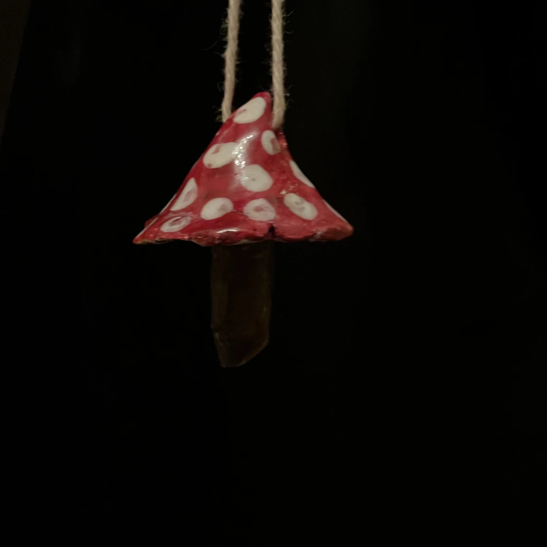 Handgjort halsband. Foten/stammen är av rökkvarts (äkta såklart) Hatten är av lera och är mycket tålig. Priset går att diskutera och jag tar även beställningar (valfri svamp, kristall och storlek) Om du har några frågor snälla var inte rädd att fråga!