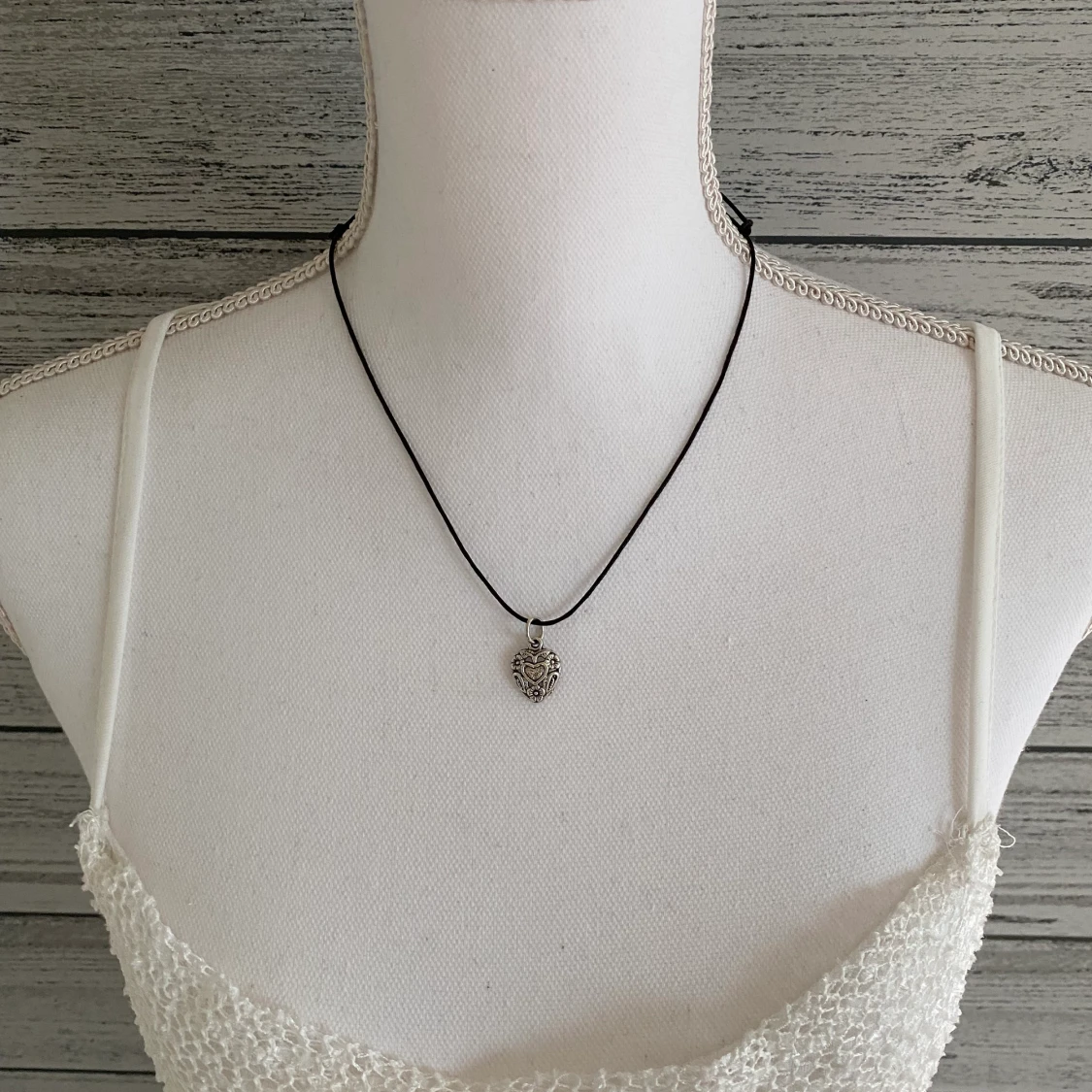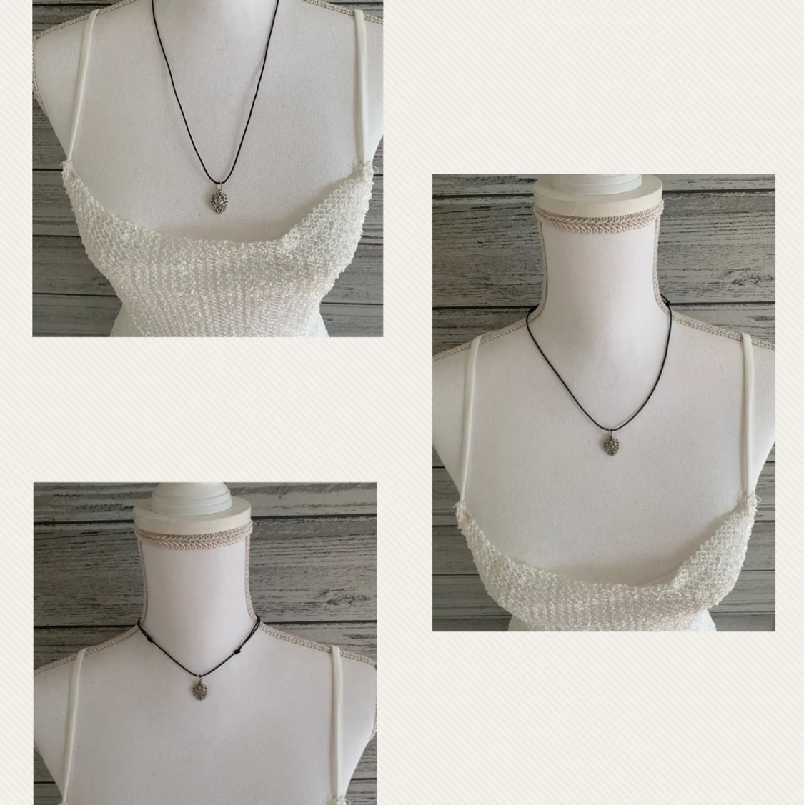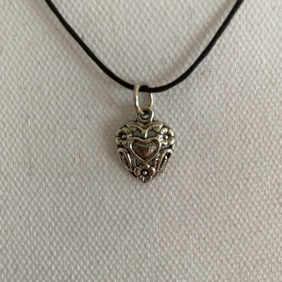 Jag säljer ett halsband som jag har gjort! Det är en liten hjärtberlock med blommor runt. Det är en form av knut som gör att man kan välja hur långt ner man vill att halsbandet ska vara! Mina halsband är nickelfria. Köparen står för frakten!