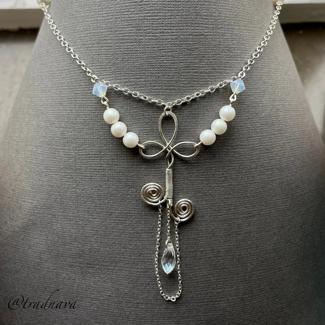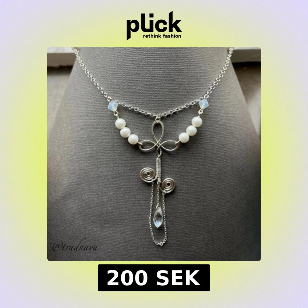 Unikt, handgjort halsband i silverpläterad koppar smyckat med vita vaxade glaspärlor, biconeformade kristaller från Preciosa samt en kristalldroppe. Jag kan enkelt ändra längd/storlek på mina smycken utan extra kostnad, det är bara att höra av dig!🌸