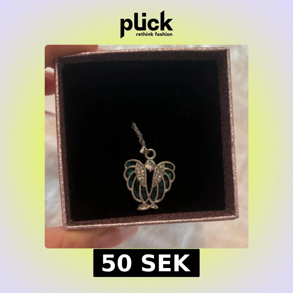 Säljer ett halsband med ett hänge i form av änglavingar. Hänget är silverfärgat med glittriga stenar och blå detaljer. Kedjan är tunn och matchar hängets färg. Perfekt för dig som gillar unika smycken med lite extra bling.