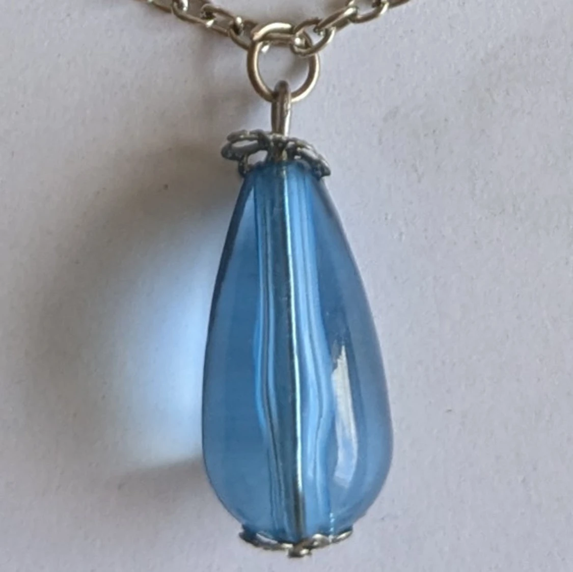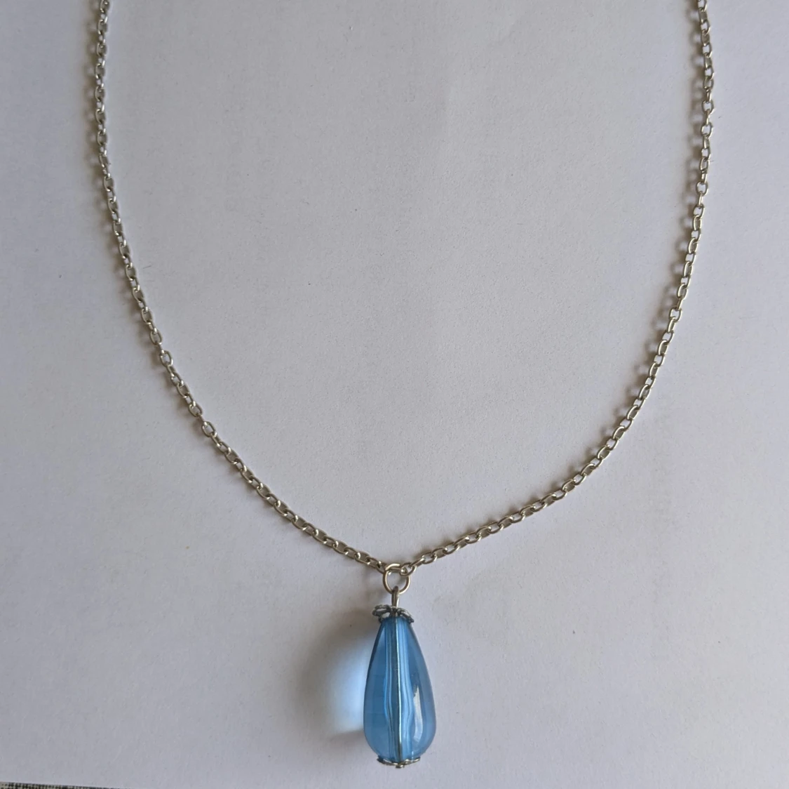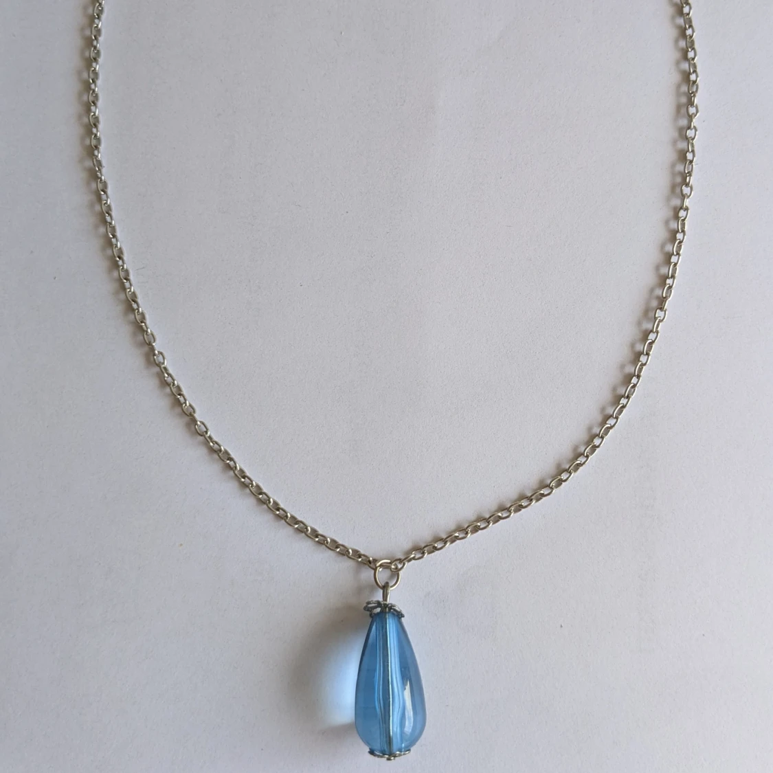 Elegant halsband med en vacker blå droppe som hänge. Kedjan är tunn och smidig, vilket gör den perfekt för att framhäva det blå hänget. Passar utmärkt för att ge en färgklick till din outfit.