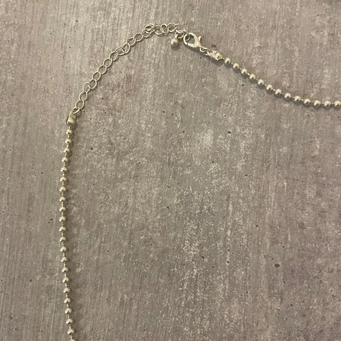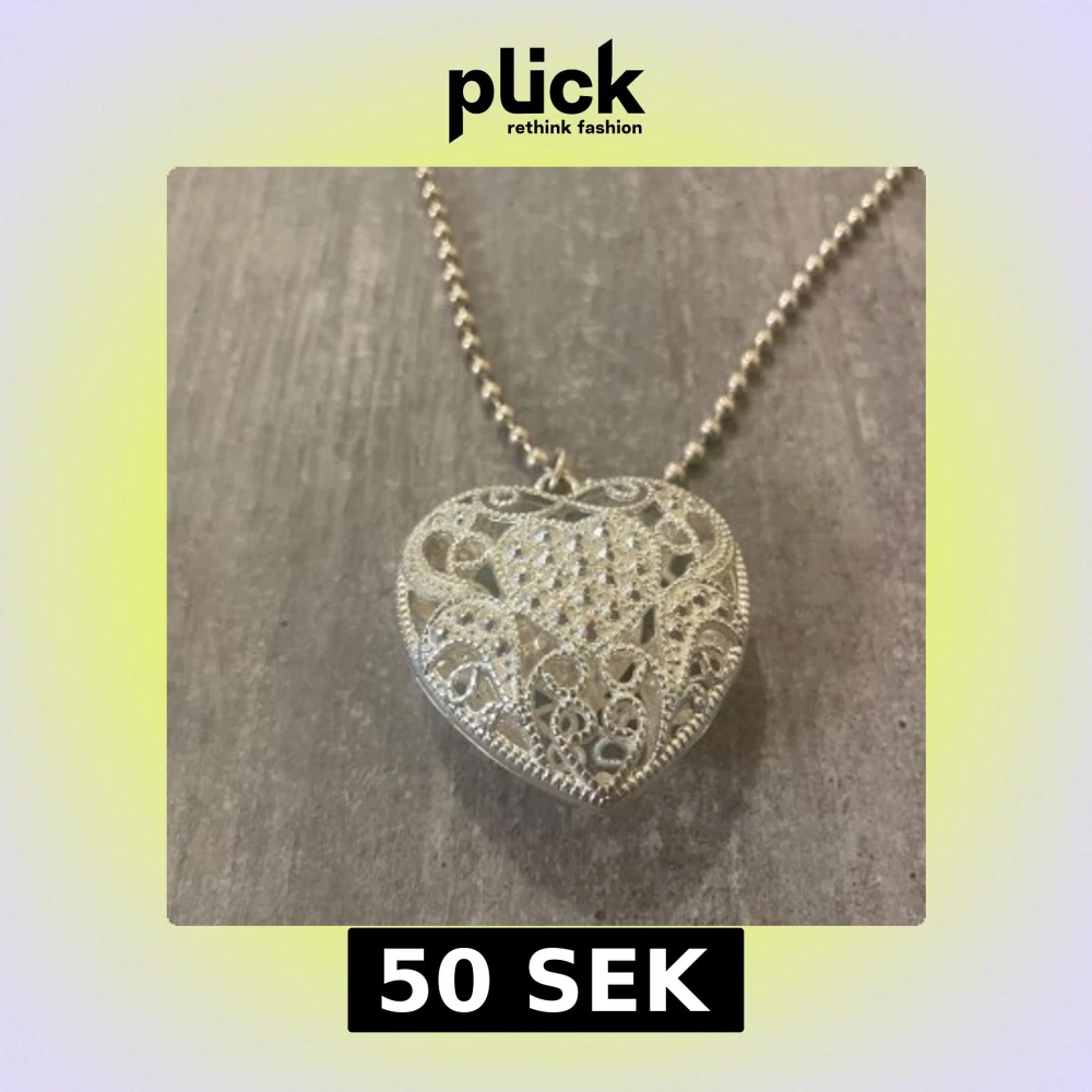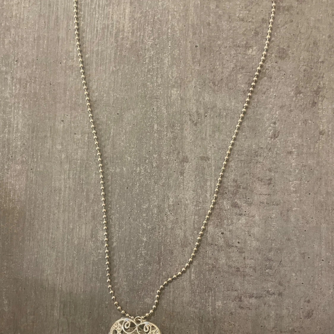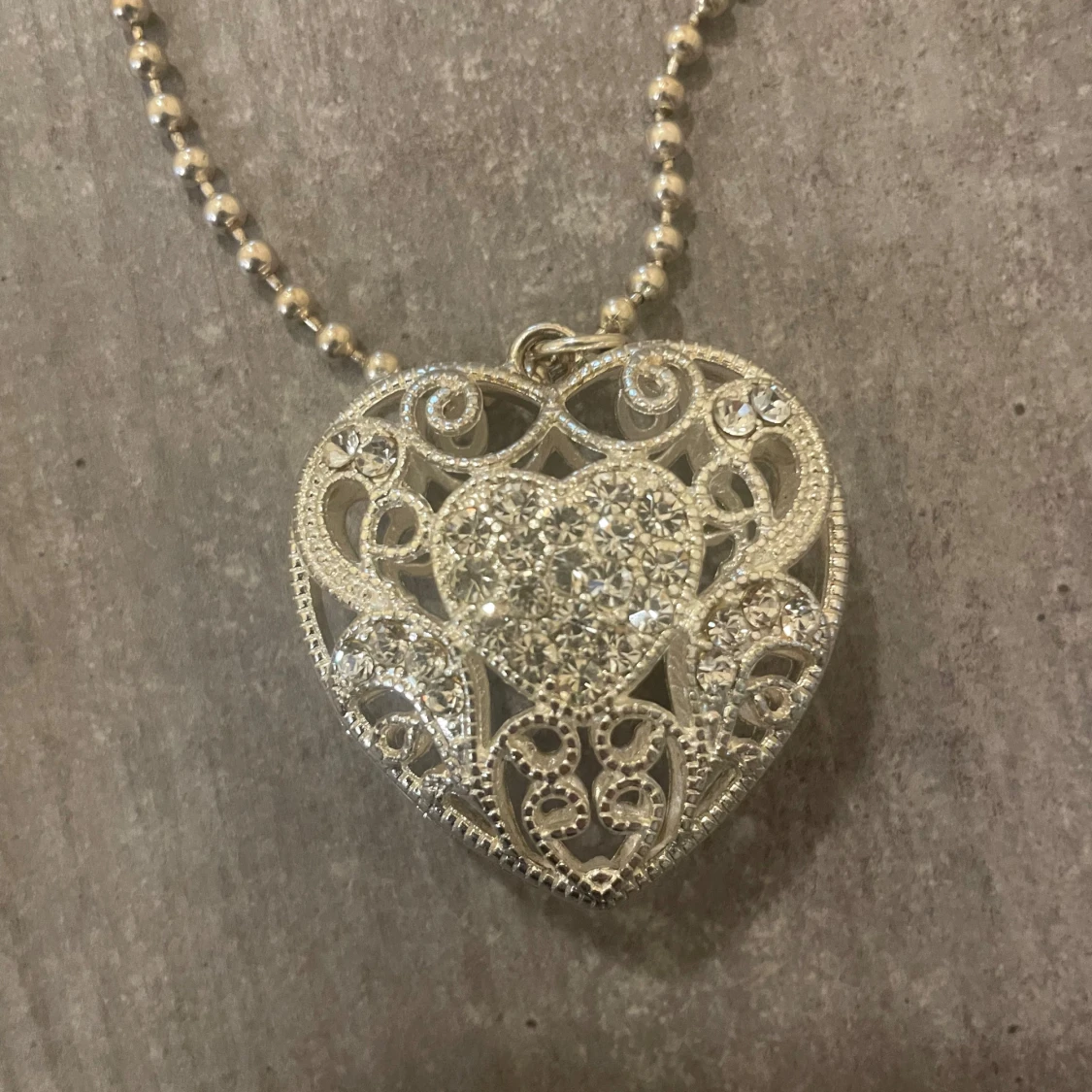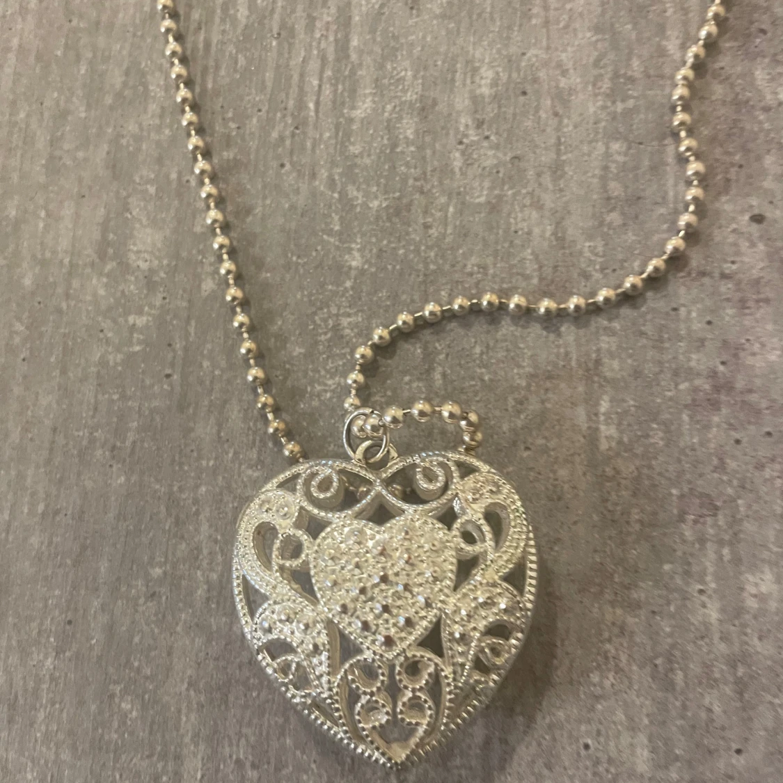Snyggt halsband i silverfärg med ett stort hjärtformat hänge. Hänget är dekorerat med glittrande stenar och har ett detaljerat, snirkligt mönster. Kedjan består av små kulor och har ett justerbart lås. Perfekt för dig som gillar statement-smycken med romantisk vibe.