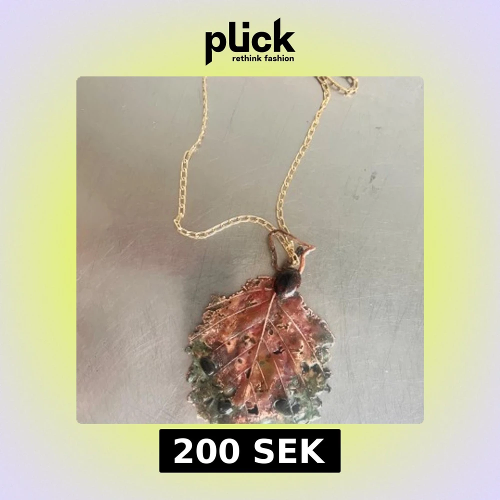 Unikt halsband med ett stort lövformat hänge i metall med inslag av grönt, koppar och svart. Kedjan är guldig och tunn, vilket ger ett elegant intryck. Hänget har en naturinspirerad design med detaljerade ådror och färgskiftningar.
