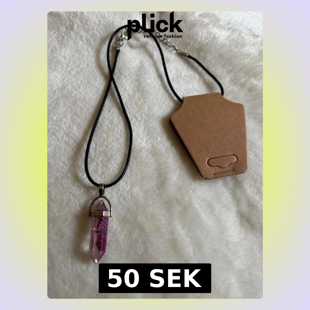 Snyggt halsband med svart snöre och ett spetsigt kristallformat hänge i rosa akryl. Hänget har silverfärgad metallfattning. Perfekt för dig som gillar unika smycken med lite magisk vibe.