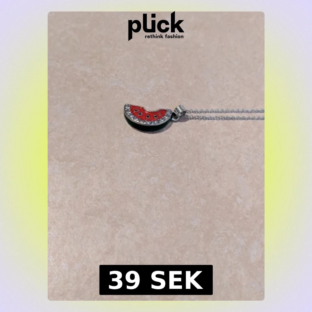 Sött halsband med ett hänge format som en vattenmelon. Hänget är rött med svarta kärnor och har en glittrig kant. Kedjan är i silverfärg och passar perfekt för dig som gillar färgglada accessoarer.