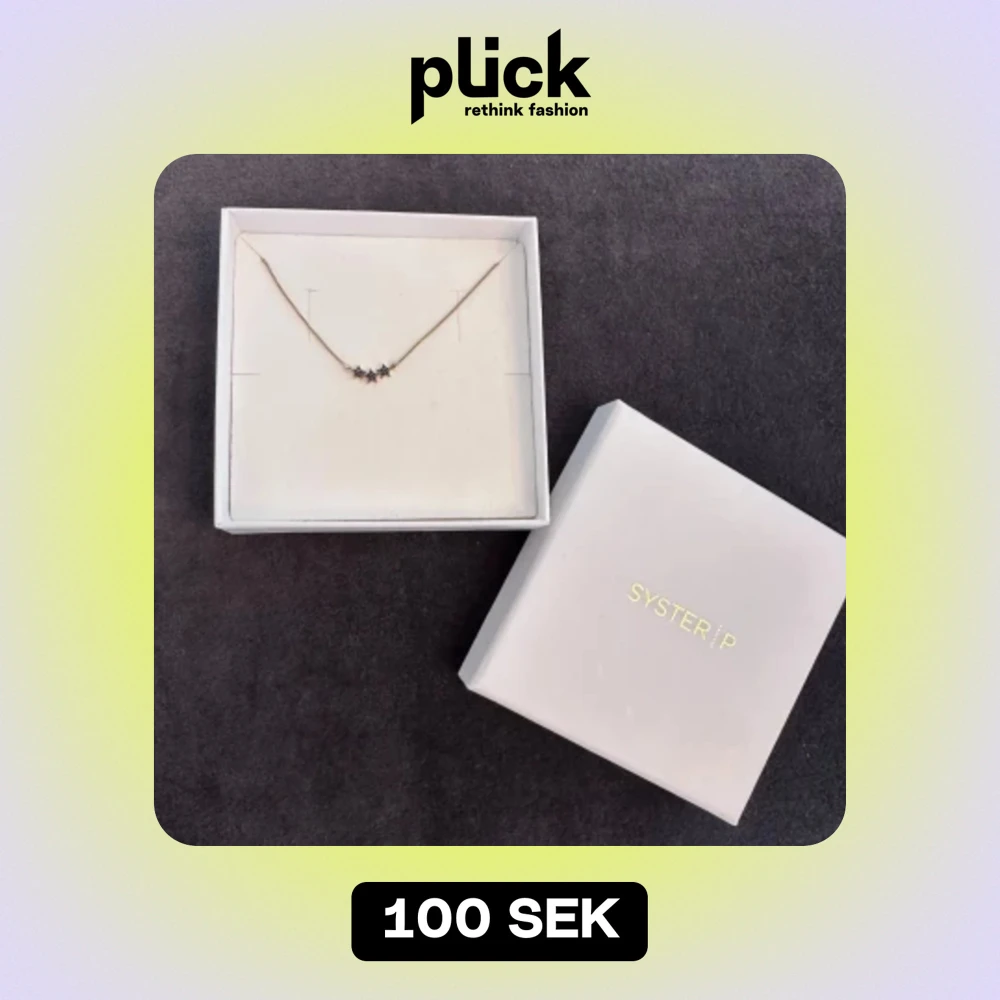Guldigt halsband från Syster P med tre små stjärnor. Varan är i gott skick och asken medföljer.