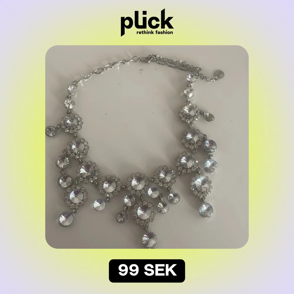Säljer ett fantastiskt glittrigt halsband i silverfärg med stora, klara stenar som fångar ljuset perfekt. En sten fattas.Perfekt för fest eller speciella tillfällen. Halsbandet har en justerbar kedja för att passa olika storlekar. Ett riktigt statement-smycke som drar blickarna till sig!