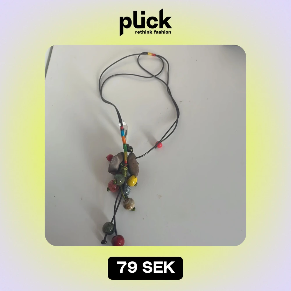 Unikt halsband med en mix av färgglada pärlor i olika former och storlekar. Halsbandet har en svart snodd med detaljer i rött och gult. Perfekt för att liva upp vilken outfit som helst! 🎨