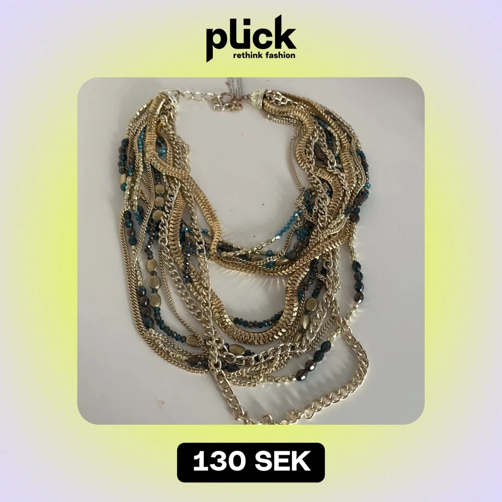 Säljer ett coolt och unikt halsband med flera lager av kedjor i guld och silver. Det har också pärlor i blått och svart som ger en extra touch. Perfekt för att piffa upp en outfit till fest eller en utekväll. Halsbandet har en justerbar kedja för att passa olika längder.