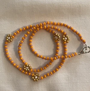 Handgjort halsband med blommor, 40,5 cm långt. Köparen står för frakten, 12kr. Samfraktar vid köp av flera smycken.