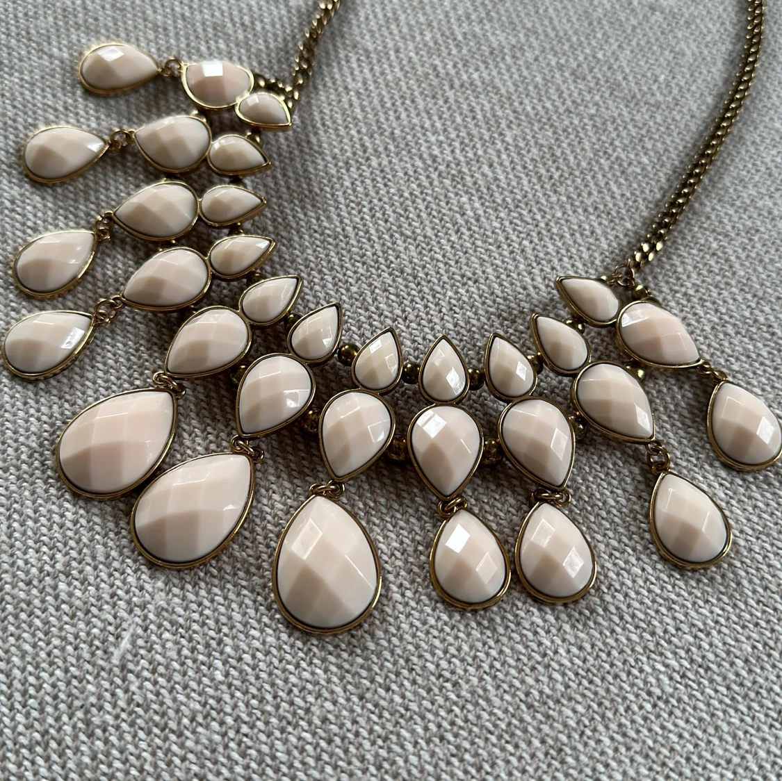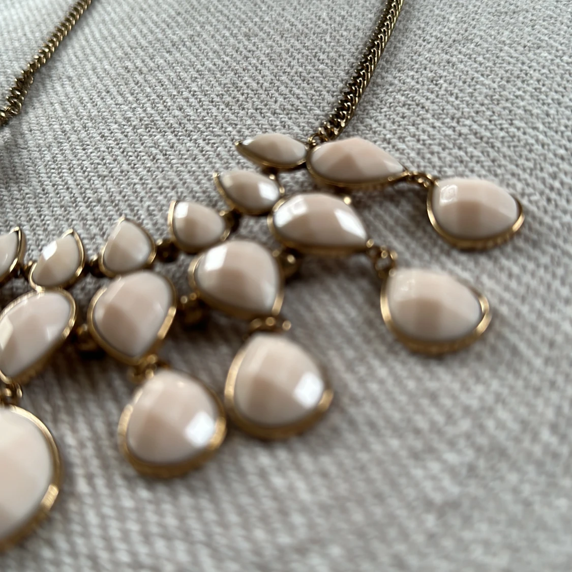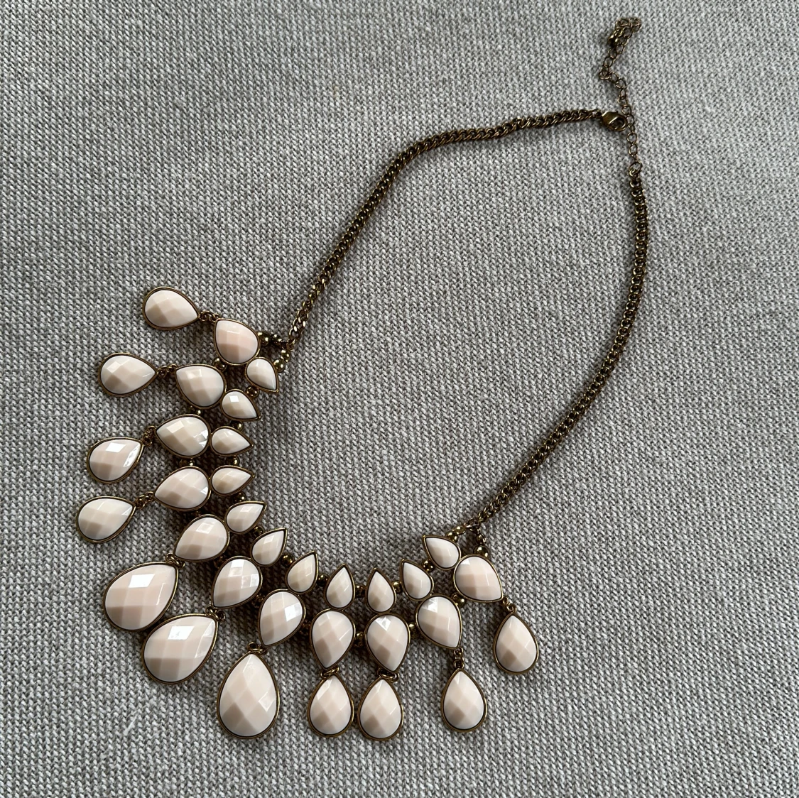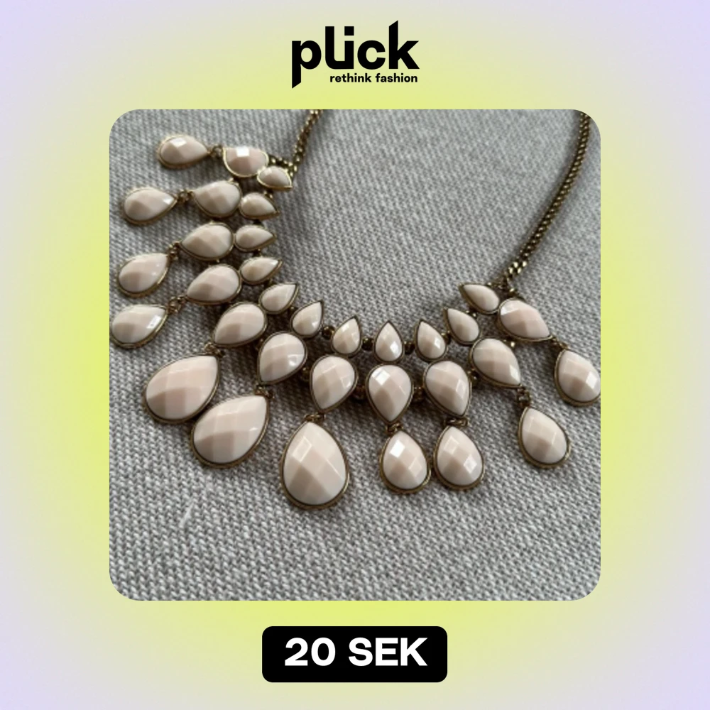 Större halsband med ljusrosa ”plaststenar” och antik mässing/guld/roseguld. Aldrig använt.