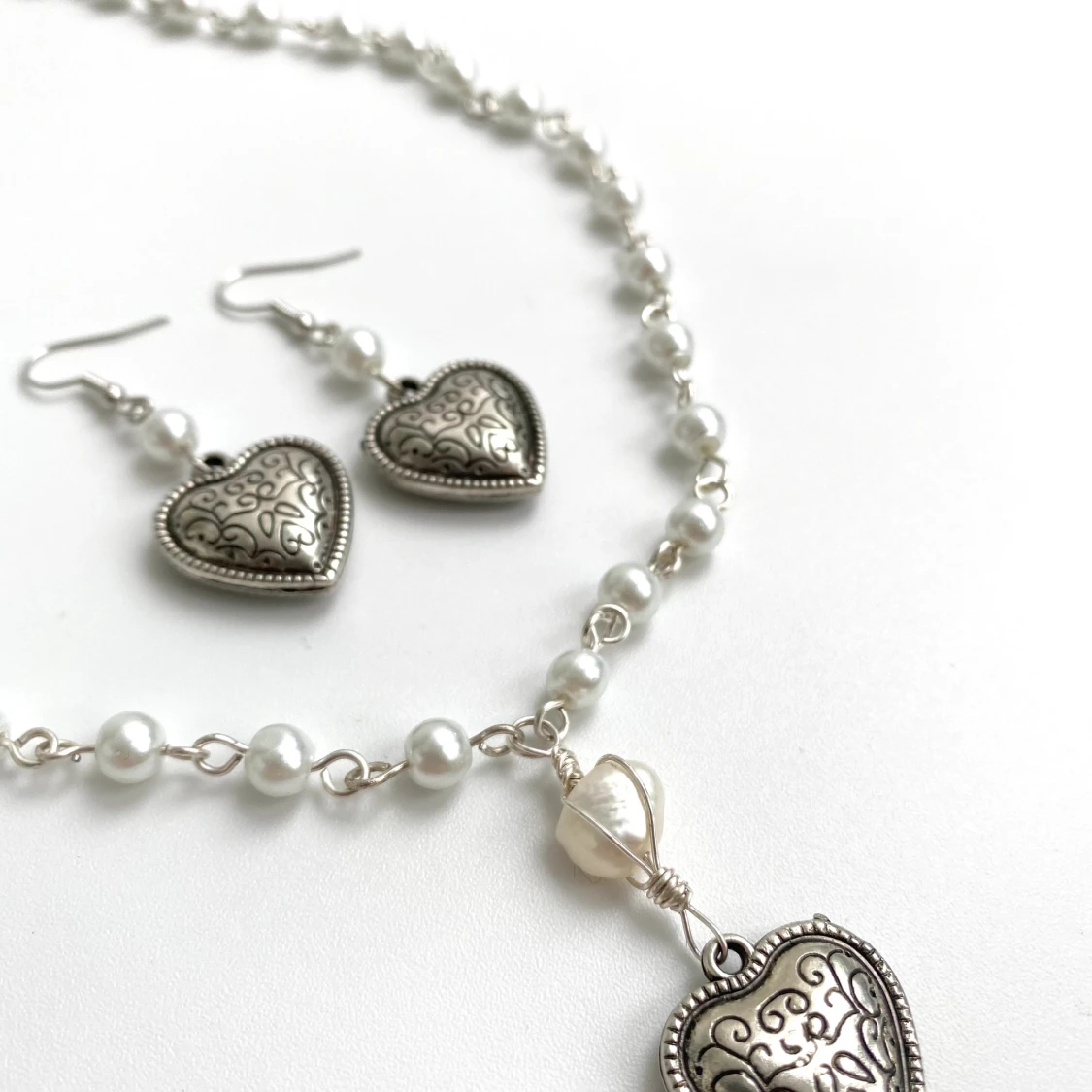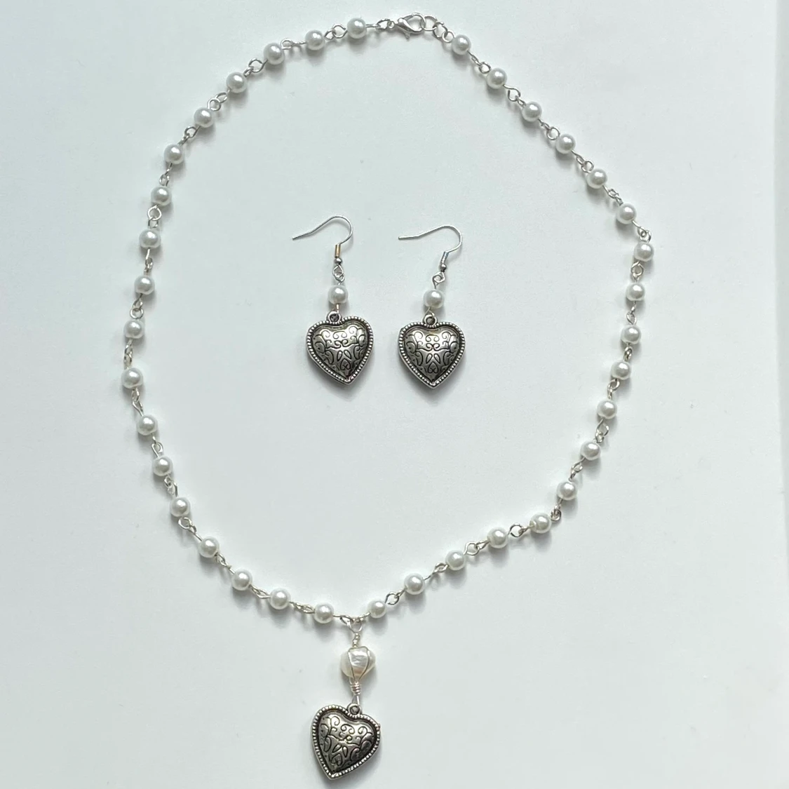 Smyckesset med pärlor och hjärt-berlock🤍 nickelfria och säljs även separat!