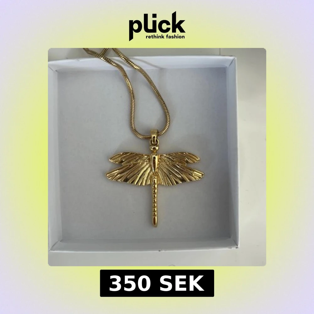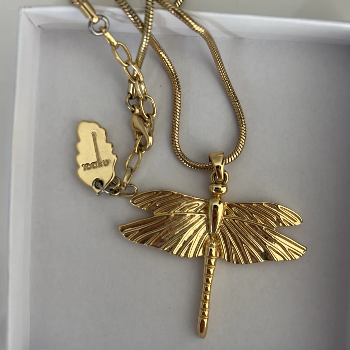 Säljer ett snyggt halsband i guldfärg från ioaku med ett stort hänge i form av en trollslända. Kedjan är ormlänk och har en exklusiv känsla. Perfekt för dig som vill sticka ut med ett unikt smycke.
