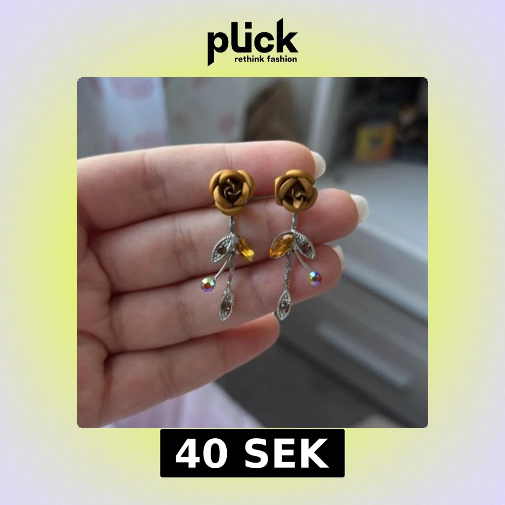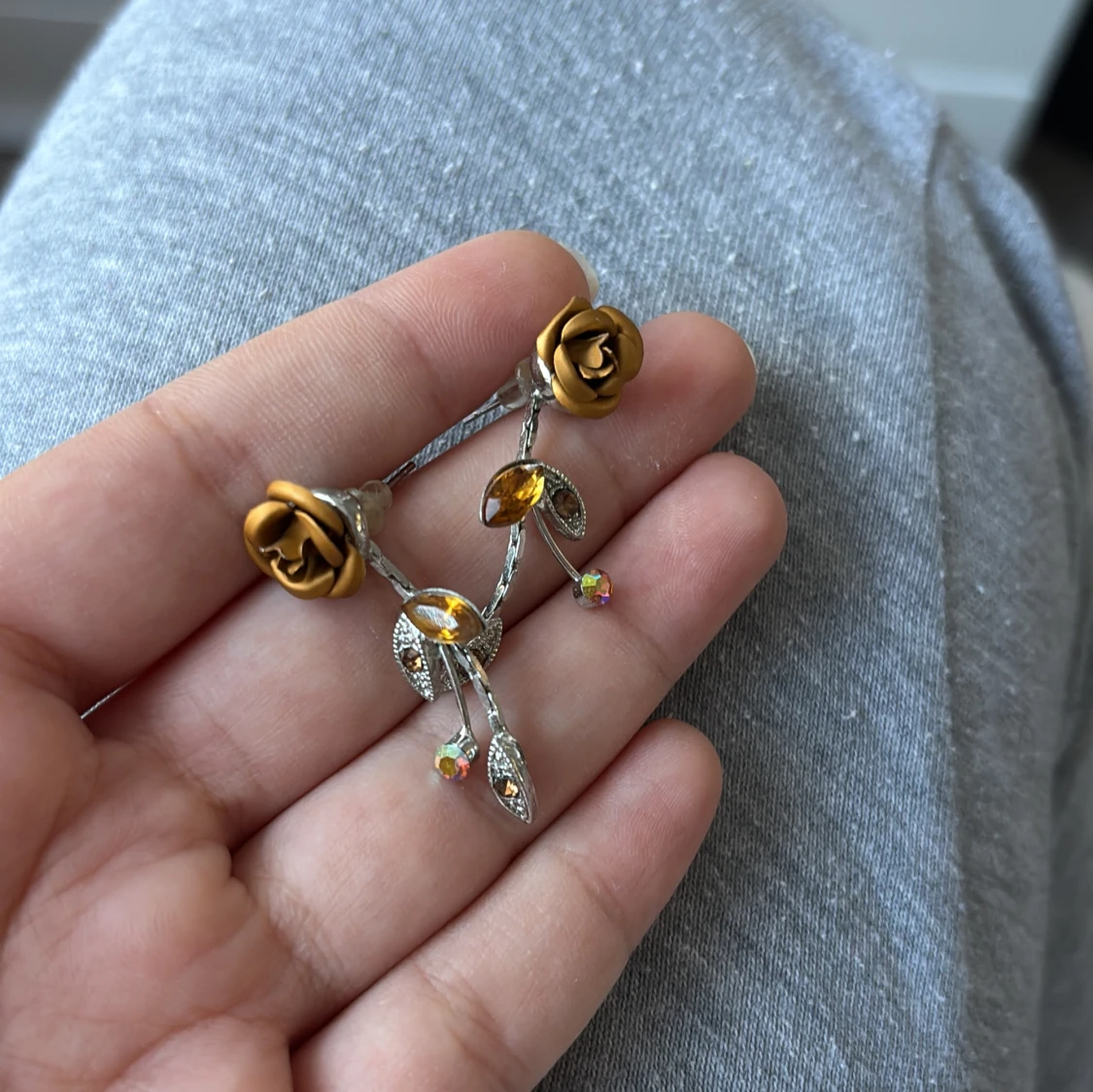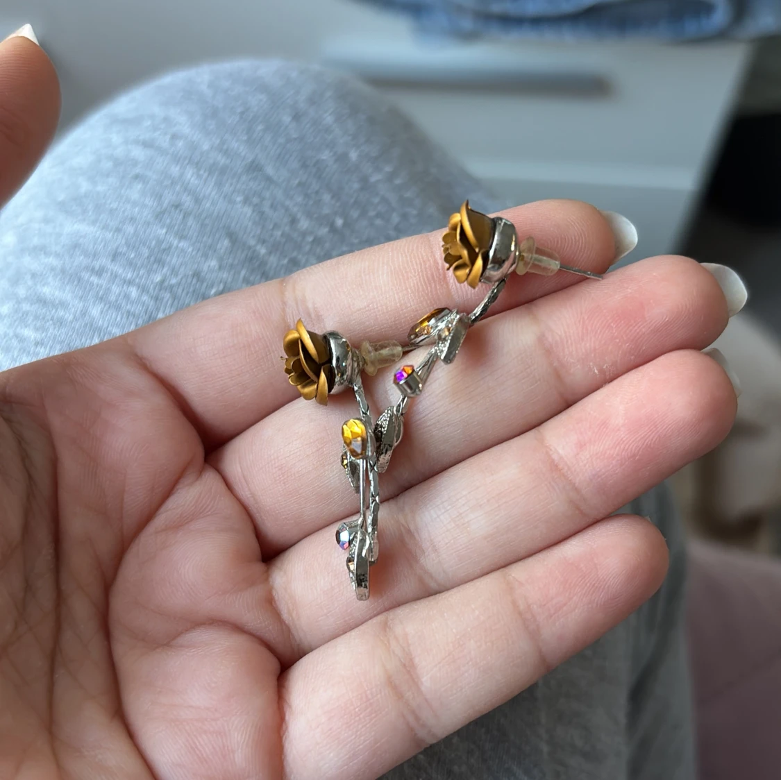 Unika örhängen med guldfärgade rosor upptill och silverfärgade stjälkar dekorerade med glittrande gula och klara kristaller. Blad och detaljer i silver ger en elegant och kreativ look. Perfekt för dig som vill sticka ut med ett blommigt smycke.