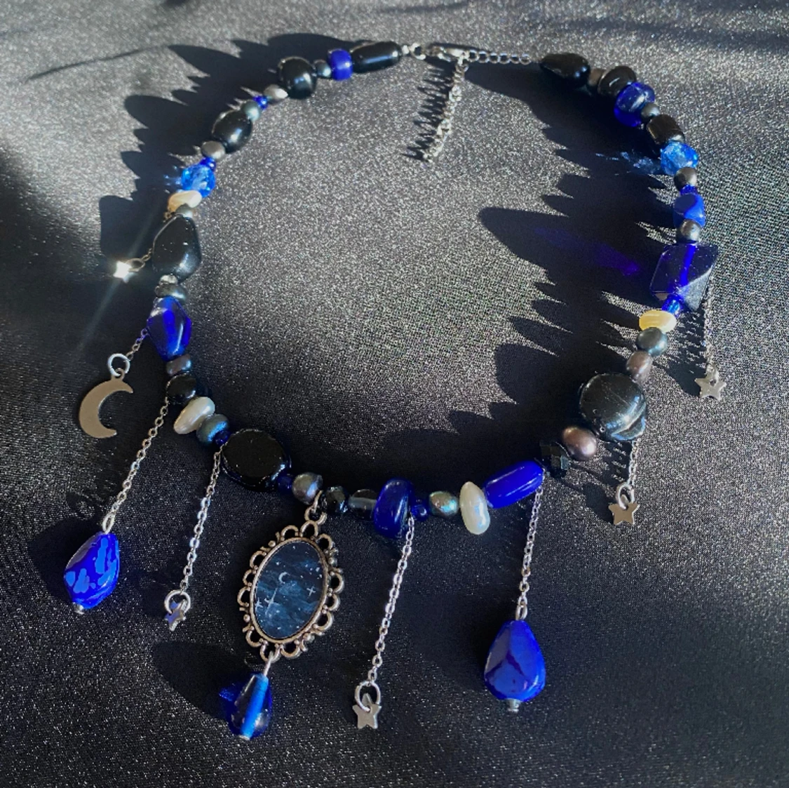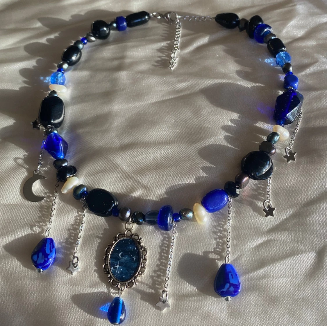 Halsband med handmålad berlock💙💫 Längden är reglerbar 39-45cm. Halsbandet är gjort av sötvattenspärlor & glaspärlor! Kika in min instagram @flyingladybugz för mer smycken💗🐞