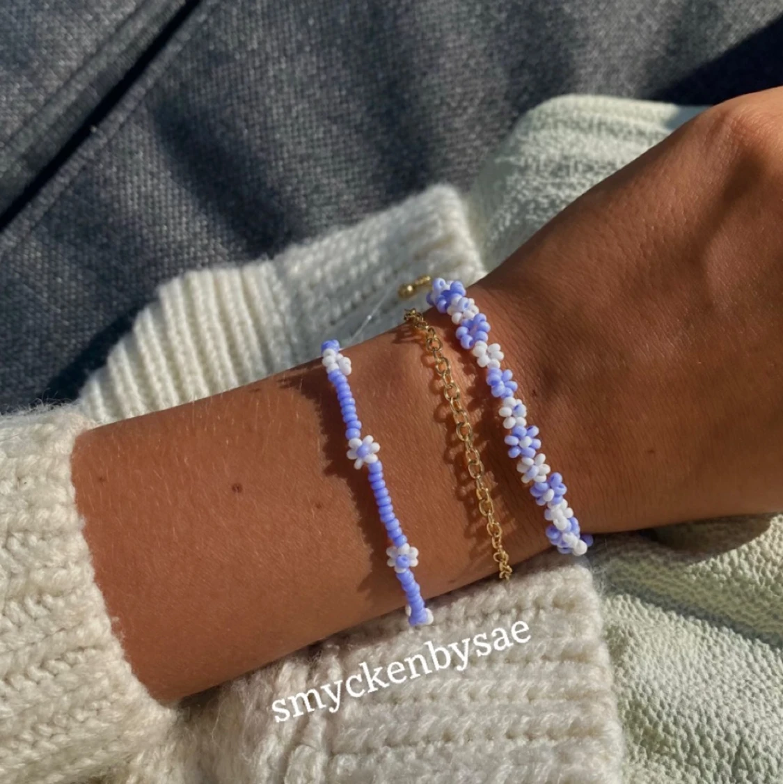 Så vackra blåa pärladearmband, perfekta till sommaren. Några blommor - 59kr, många blommor - 79kr. Köp båda i ett sett för 120kr💗💗 13kr frakt
